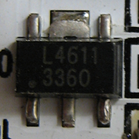 From the duplicity of the PCB (there are two strings of LEDs, warm/cool, only one of which works now) I believe the trashed part is the same as the one on the upper circuit, marked with L4611 / 3360 but no visible brand marking: