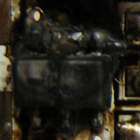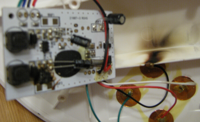 The structural ribbing in the lamp housing is blackened above where the component was sitting. Guessing the PCB should have been fastened on an angle to keep the hot bits away from the plastic. The copper discs in the background are capacitive pads for the controls, which now glitch out to varying degrees.
