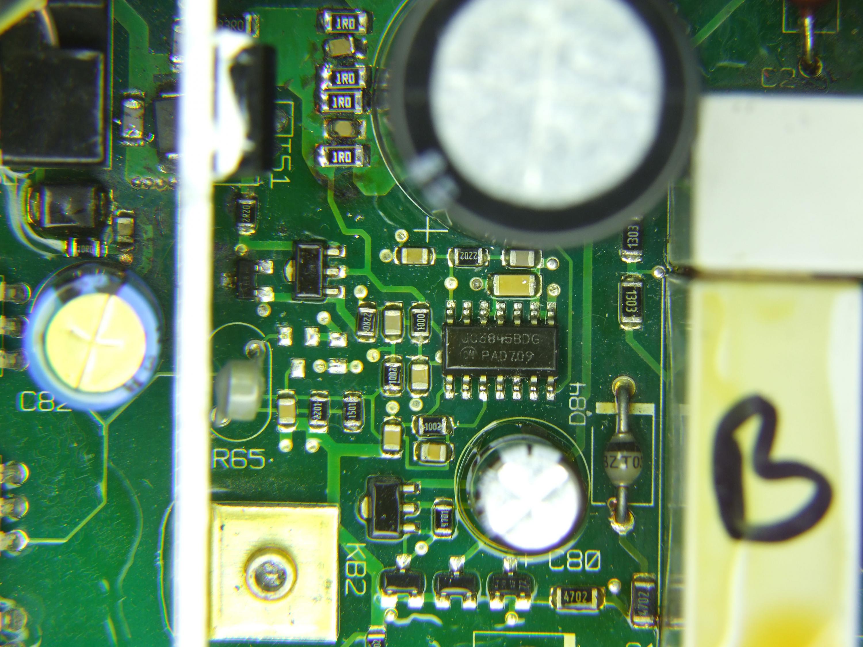VCC on power IC (UC3845) is 8V steady, although according to datasheet it should be around 32V or 15V and above in order to get started.