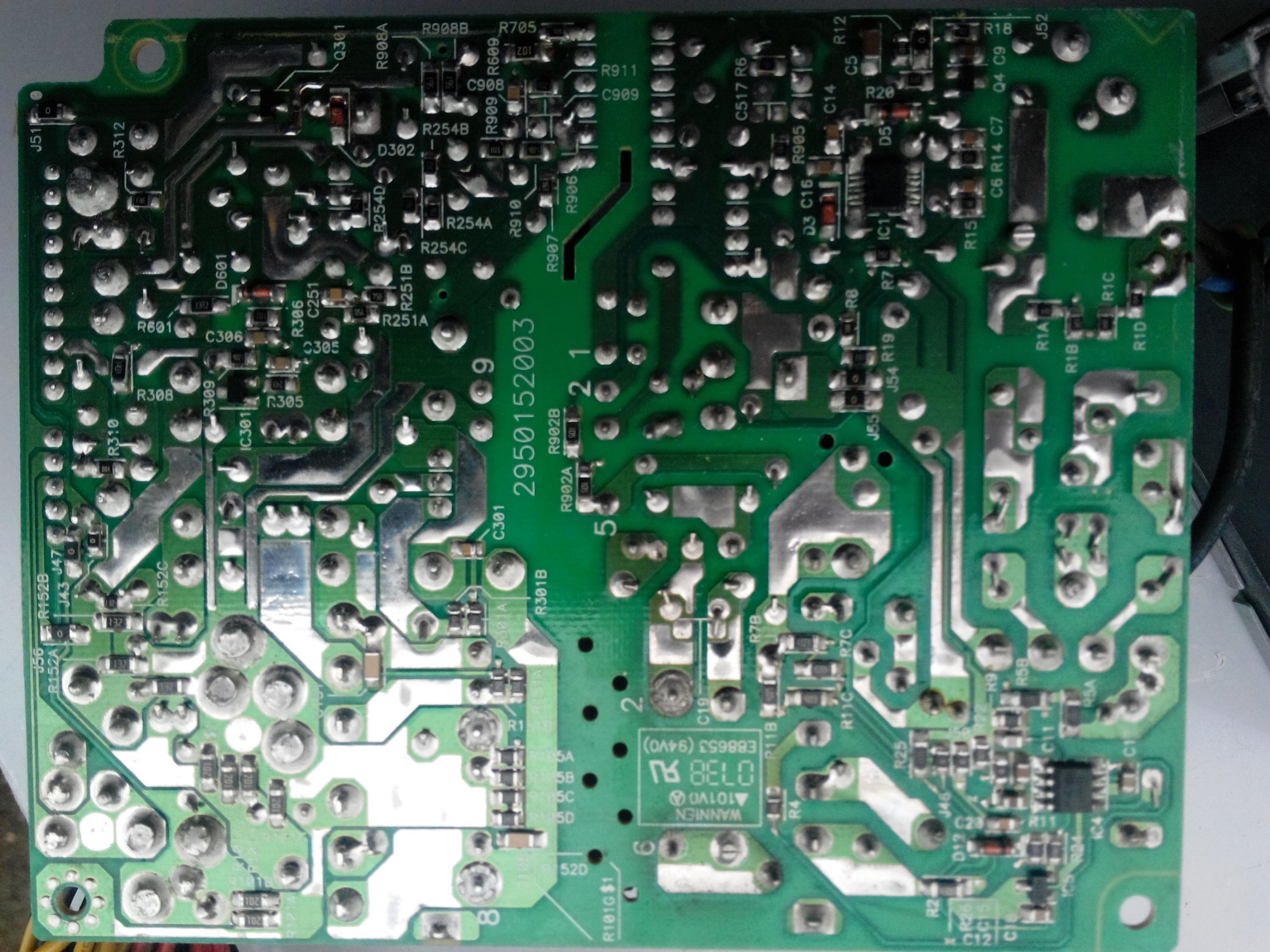 Surprise: 3 swollen capacitors, one being wrapped in plastic, probably for insulation.