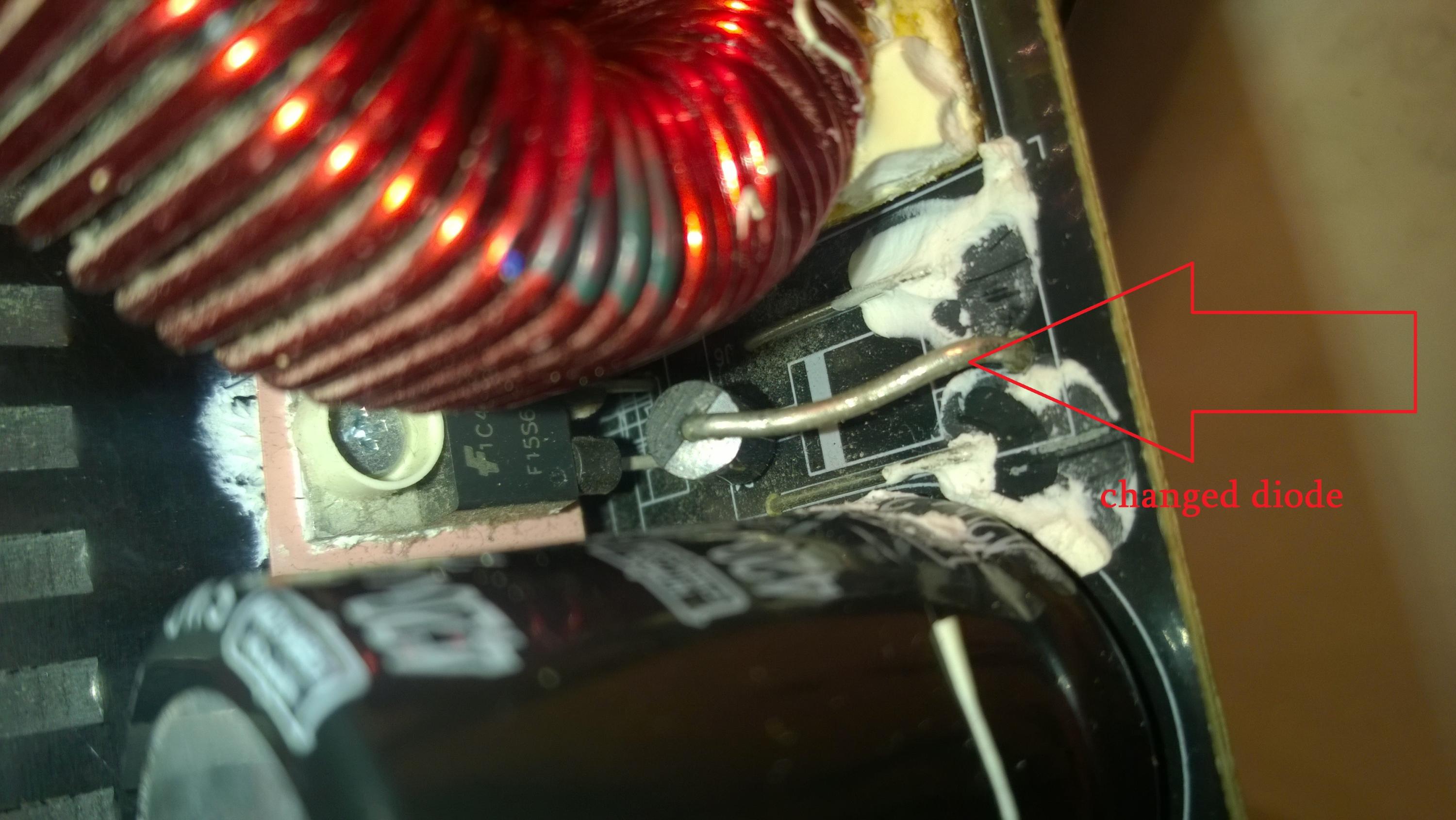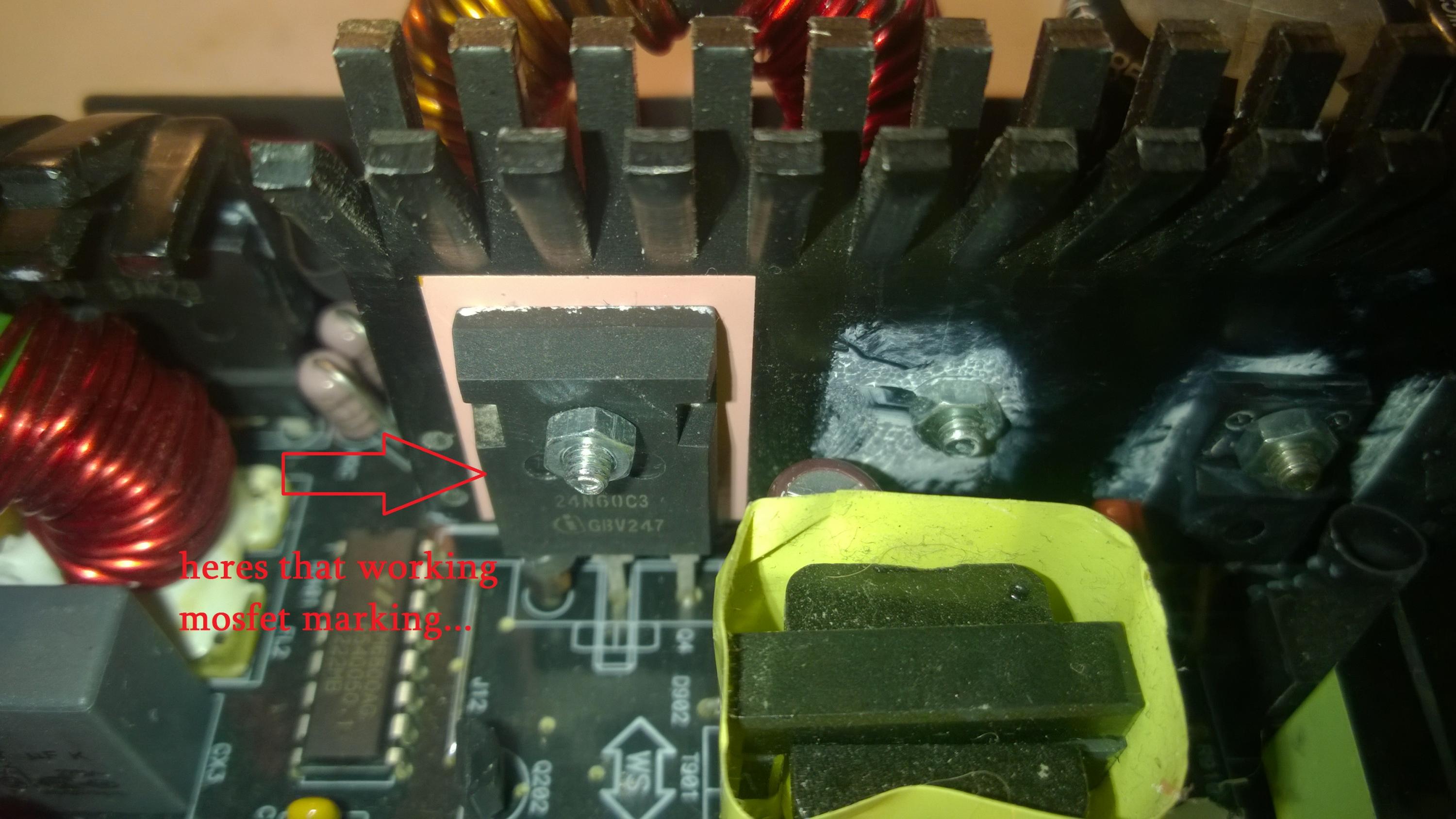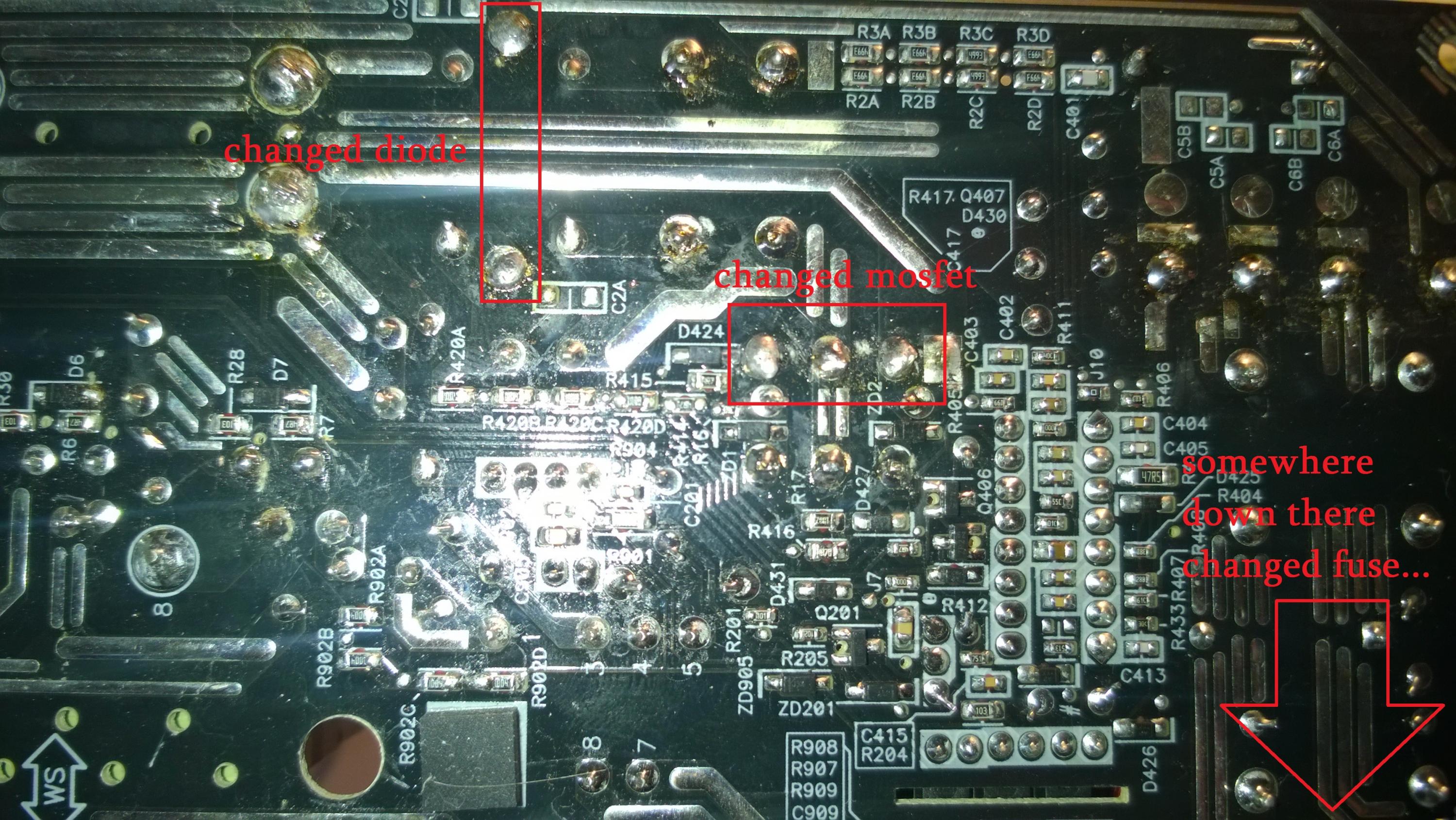 I had several scrap psus (all from 600w to 1200w (thermaltake,PC P&C silencer, rocketfish,Tagan etc..)) so I took exact same diode from Rocketfish 750w soldered it onto antec, then found similar mosfet on rocketfish, desoldered it and appears it's 20n60c3, but we need 24n60c3 ... well, so i just took 20n60c3 and soldered onto antek psu, assembled everything, turned on, whoa ! it works