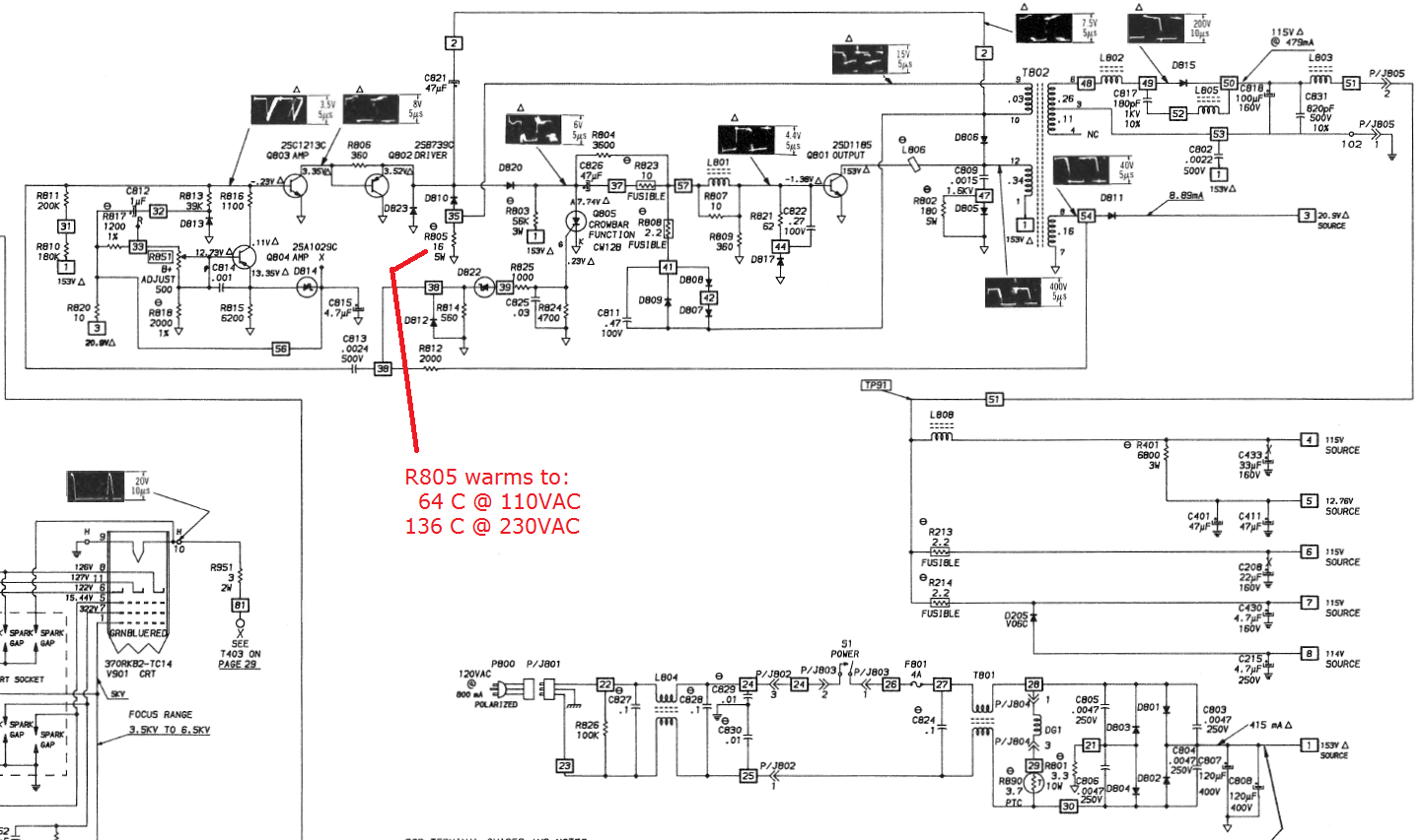 Under bench testing with a dummy load and the unit open in still air, using thermocouples I've narrowed the main heat source down to one power resistor, identified in the attached schematic. I don't understand enough about SMPS design so need assistance to understand if there is a minor design change that would reduce the heat losses off that part. The 136 C measured would not normally be of concern, but it will be much higher in the enclosure, inside the monitor. Other power resistors and the main switching transistor run at the same temp as they did under 110 VAC, and there are no additional noises that make me think the unit is under stress.