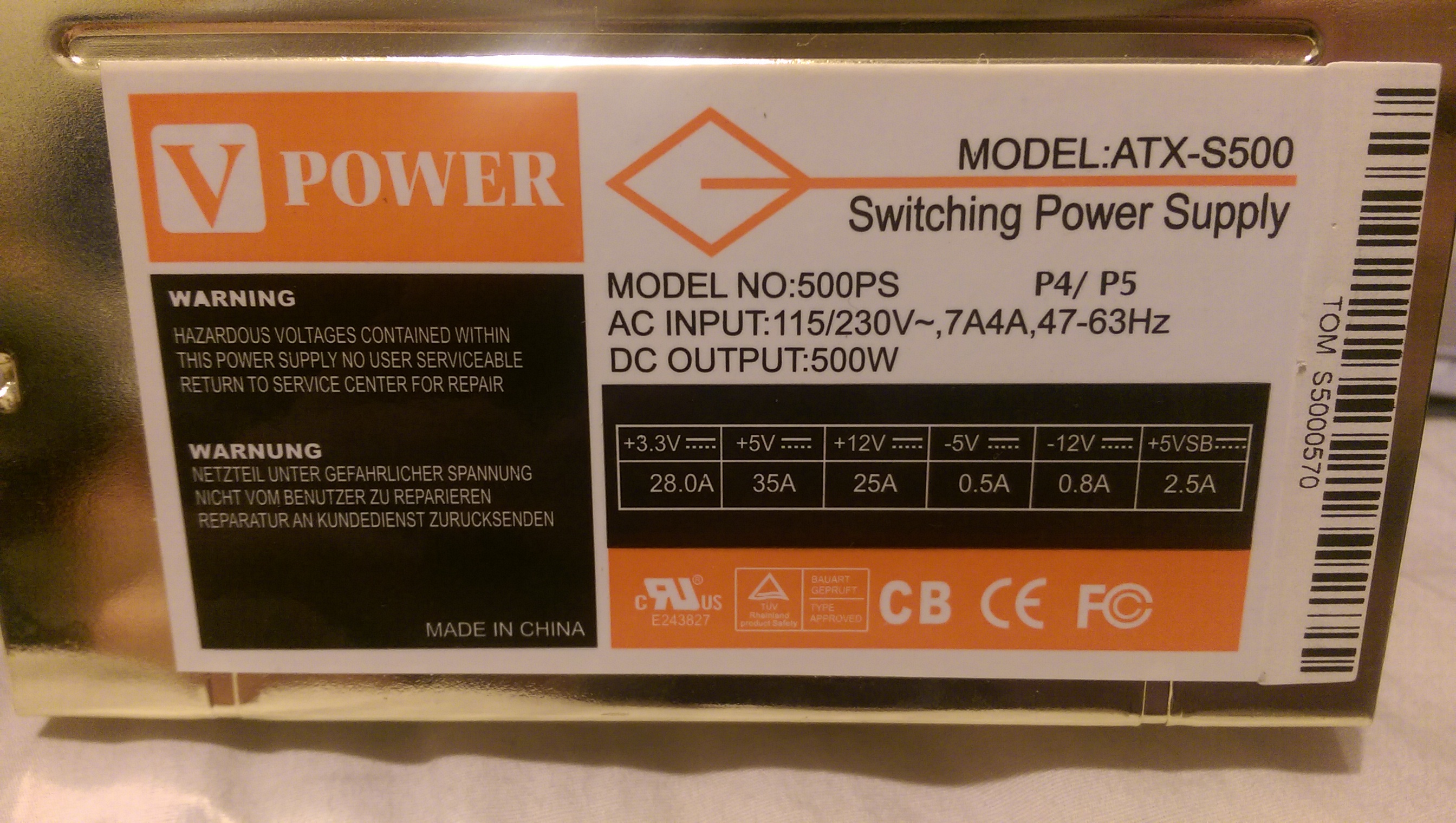 The Te Bao fans both had their labels peeling off. There is one on the top for intake and the usual one for exhaust. They had some grease left in them but were getting dry due to the label pealing. I put oil in them and then glued the stickers back on there. All the wiring is 18AWG. It has a PCIE 6 pin but probably won't be using it. I'm building a HTPC for my brother, and I'm going to use this PSU. It will just be powering a Radeon HD 4670.