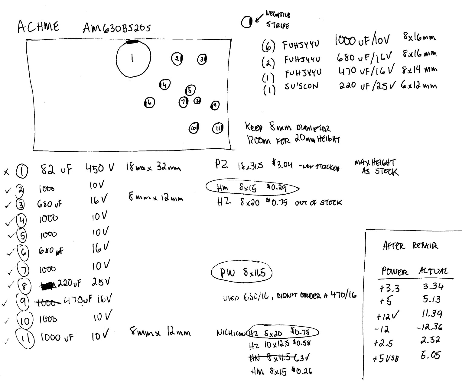 I replaced all 10 caps with Nichocon HZ and HM from Mouser. There was one 220/25/6x12, and I had to squeeze an 8mm PW in there. I only made one mistake and didn't order a 470/16, so I used a 680/16 in its place. oops. The machine has been stable and turns on correctly. I'm a little disappointed that the +12V rail is showing 11.39V, that seems a little low.