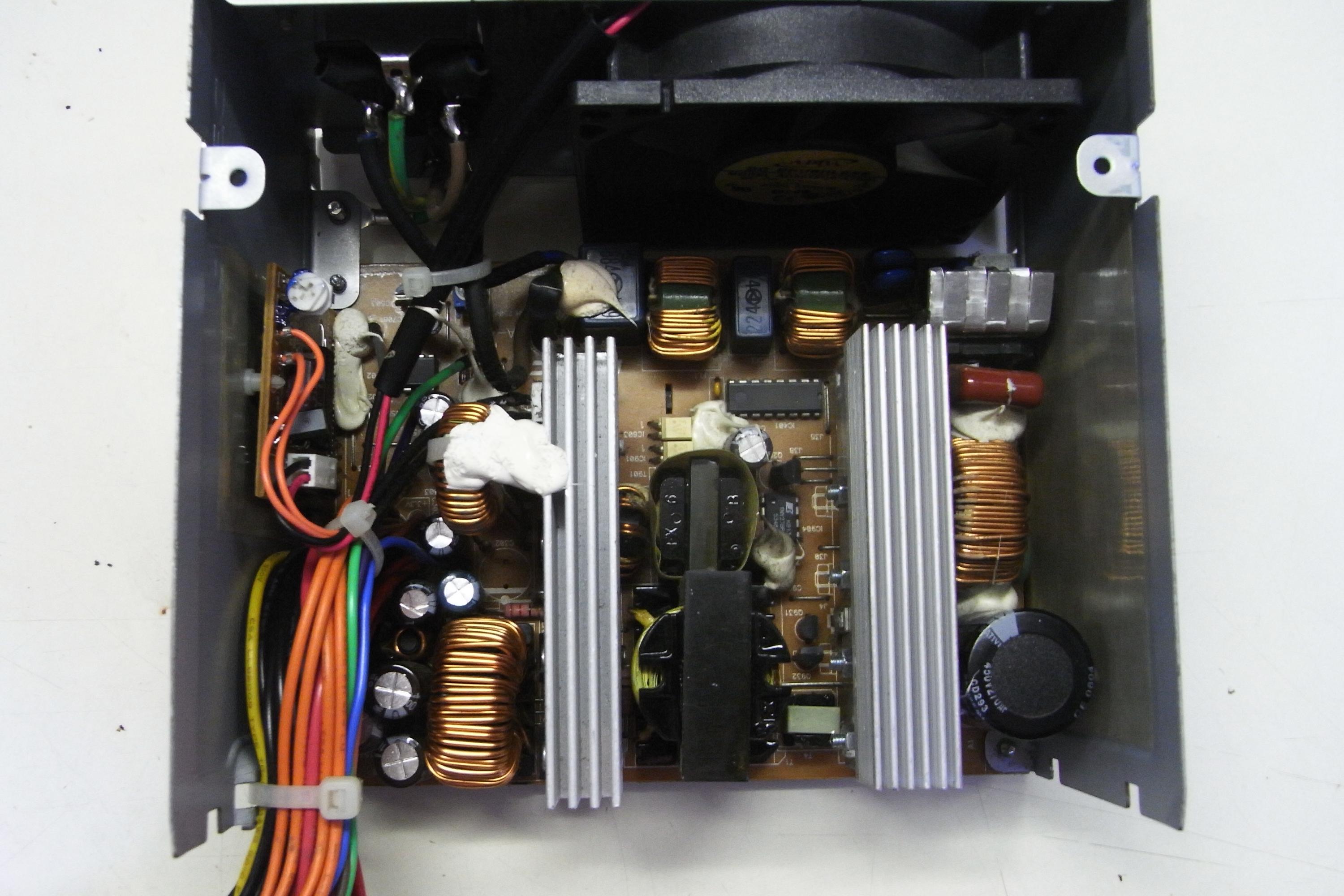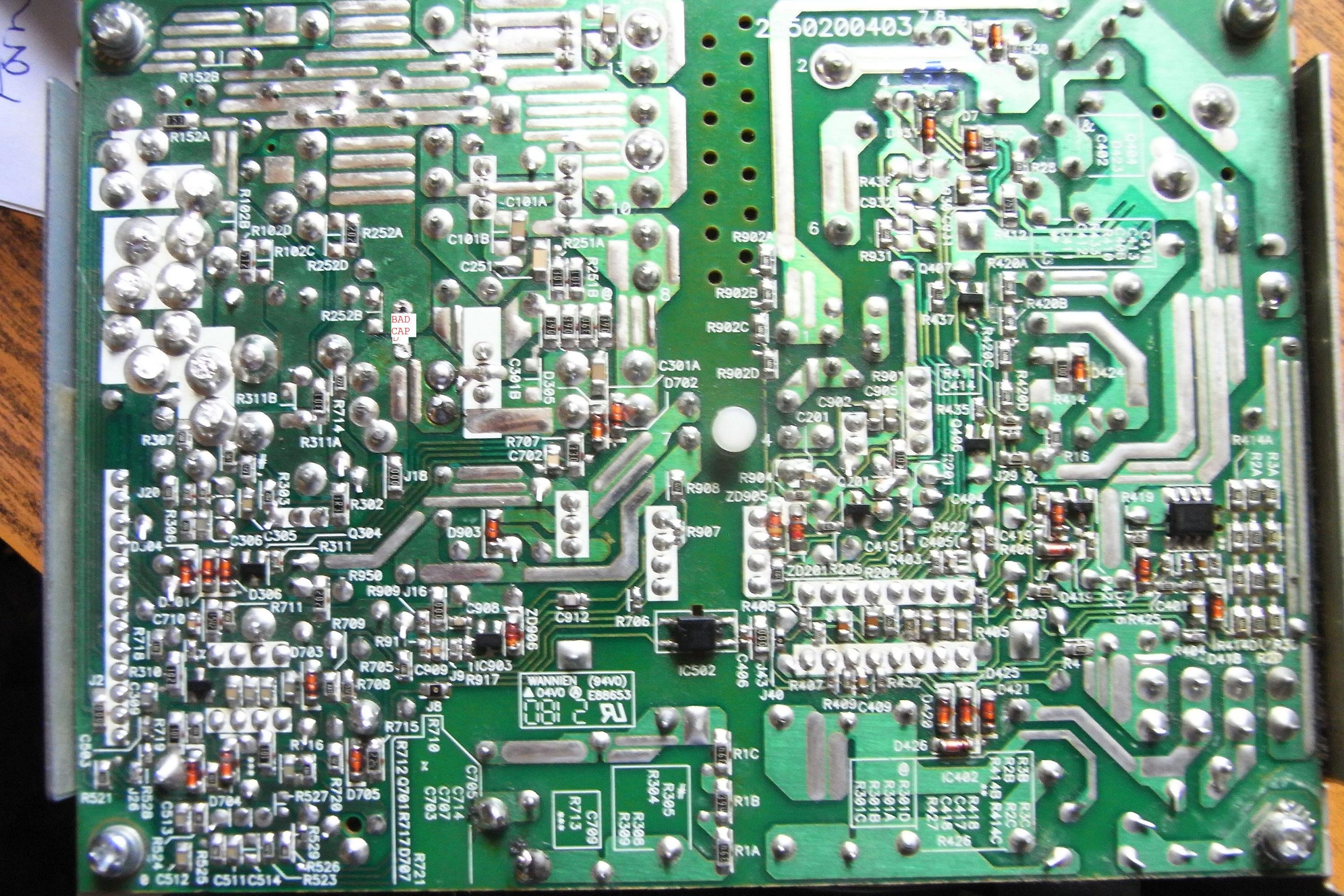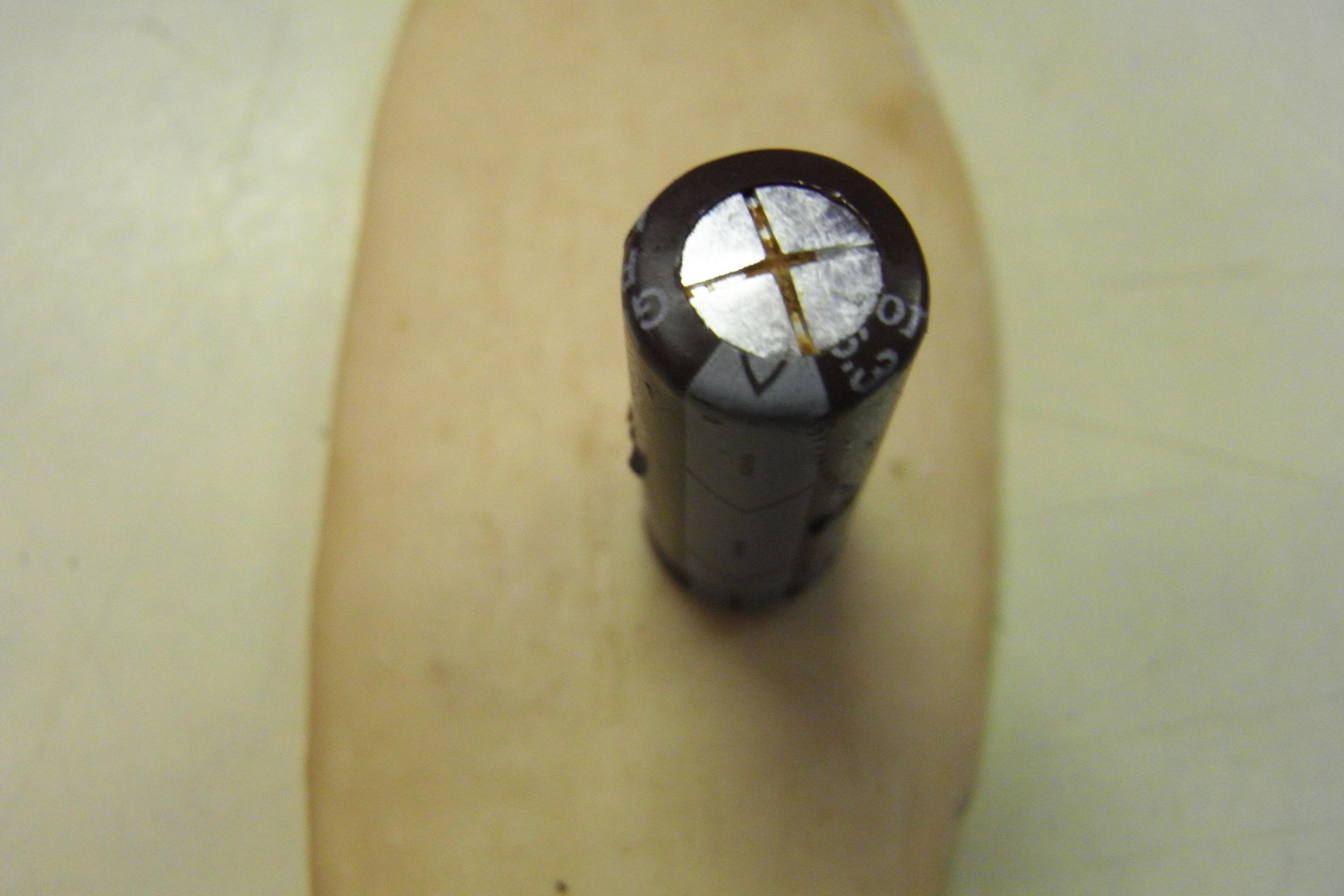 A 3300 uF 6.3 V cap is swollen and had brown gunge in the cross channels