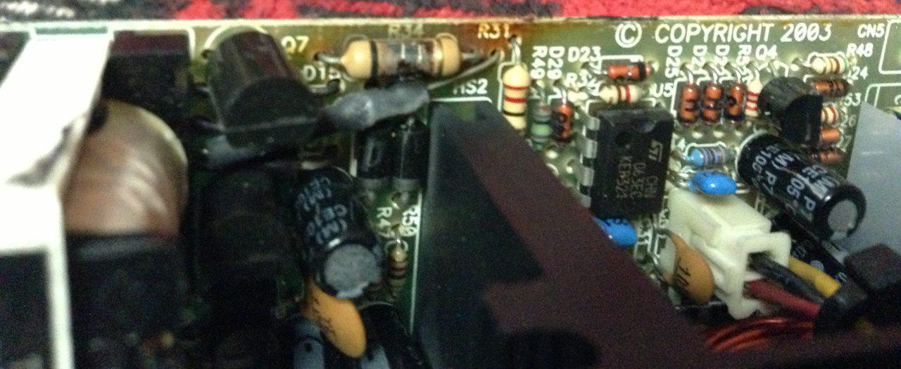 The faulty part is quite obvious from the burn area near the 16pin KA7500 BD pwm. The fuse is still intact with good continuity.