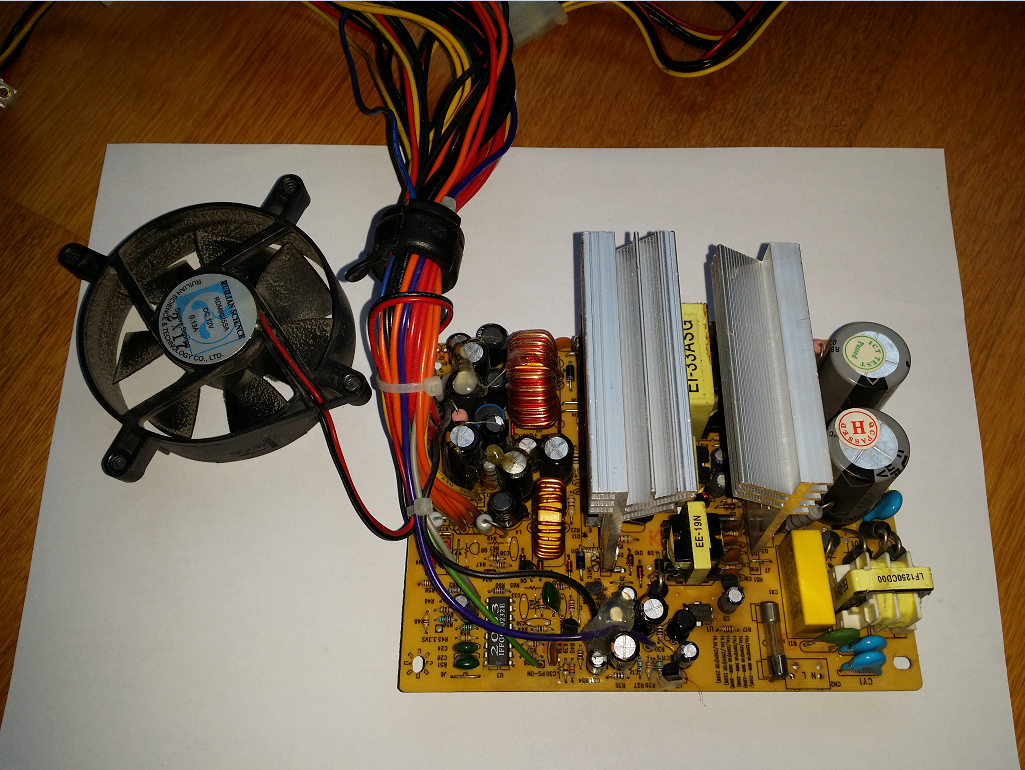 All the parts come from an AIO PSU that I can only identify as "XEPEX E140166). It's pretty well built - GBU608 bridge rectifier, full input filtering with safety approved Y capacitors, ceramic fuse (might reuse that). Primary had a 82uF 450V Toshin Kogyo (TK, aka OST) LGW cap and secondaries were FULL of KZE and KY caps. Transformer is an EI33, and I guess they used that because the PSU is pretty small. (it was intended for an space that is half as tall as an normal PC PSU). Main PWM chip on that is an usual CM6800I.