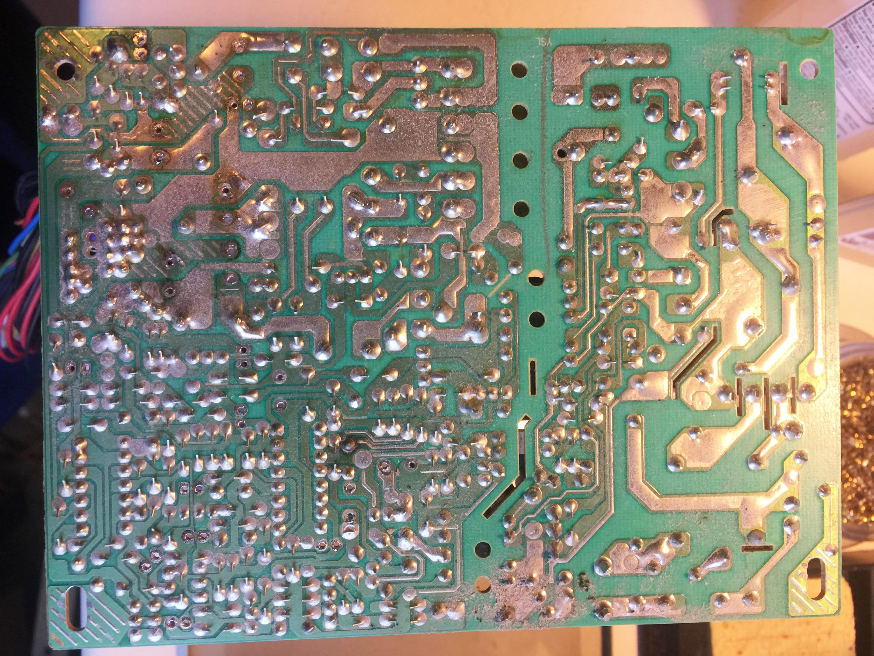 In the 5vsb "area" (middle third), I found something rather disturbing. Check out R25, glue (partially removed), and the orange area of the board - all next to TL494CN - PWM control, is it not? What the heck is going on/has happened?