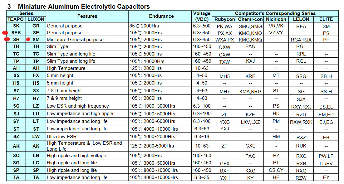 That said, the example you gave above with the ripple current of the Teapo SEK vs. Chemicon KMG is less than 5% difference between the two. You can be sure as heck it won't matter in a real circuit - or it better not. If it does, then that circuit was designed very badly to begin with. A good design (or even a merely decent one, for that matter) will never have components run near their maximum ratings.