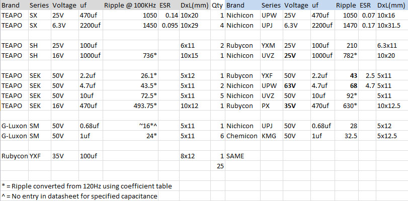 Originals on the left column and replacements on the right. Lead spacing was accounted for for each cap but not included in the spreadsheet. I also couldn't find an entry for G-Luxon SM series 0.68uf in any datasheet, but I feel the Nichicon UPJ should be fine. The G-Luxon ripple value for that cap is a guess. A few of the bolded numbers demonstrate a noticeable difference between old and new (i.e. Ripple in a few spots)