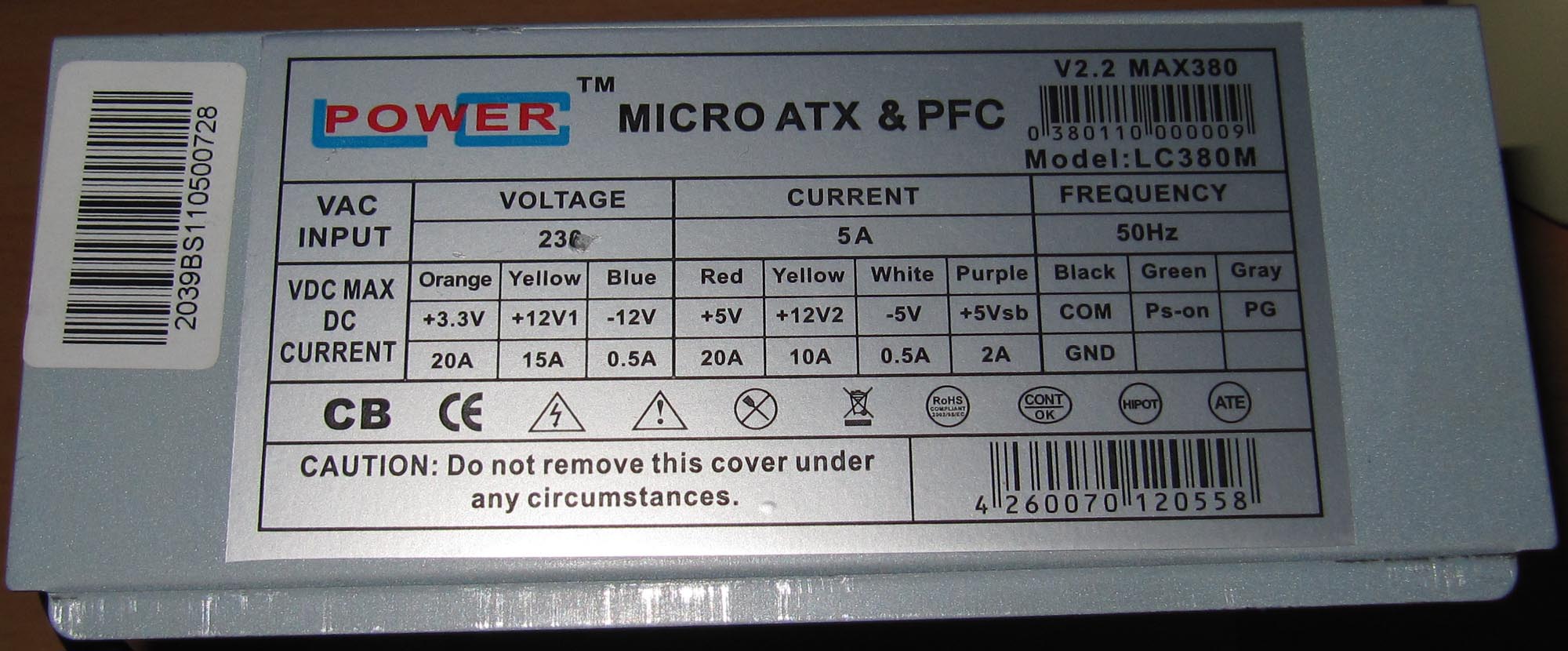 This is a micro ATX LC Power power supply, not L&C. The label is missing info such as 3.3V & 5V combined power, 12V total output power and total output power. How convenient!