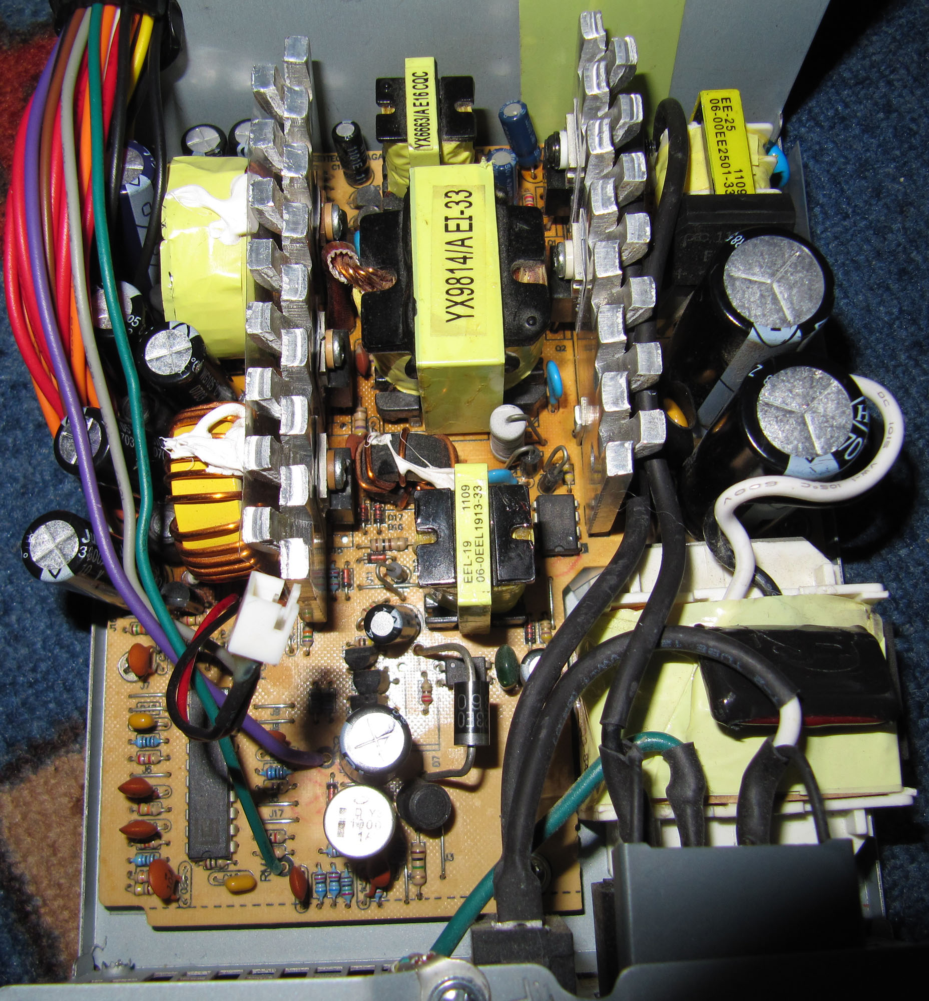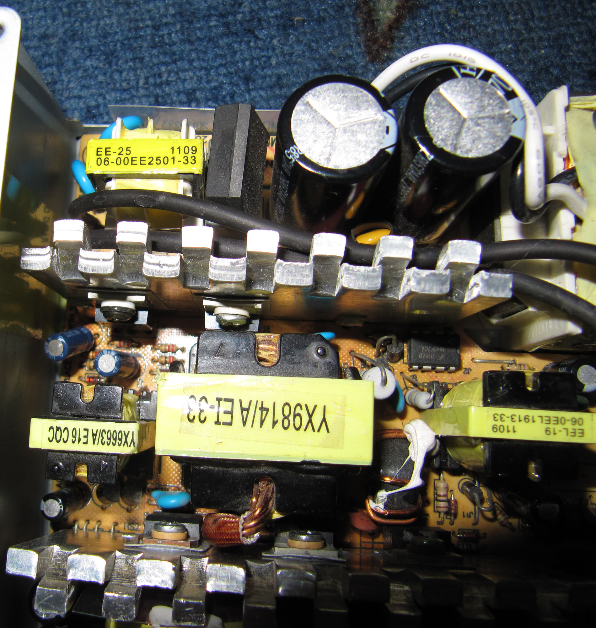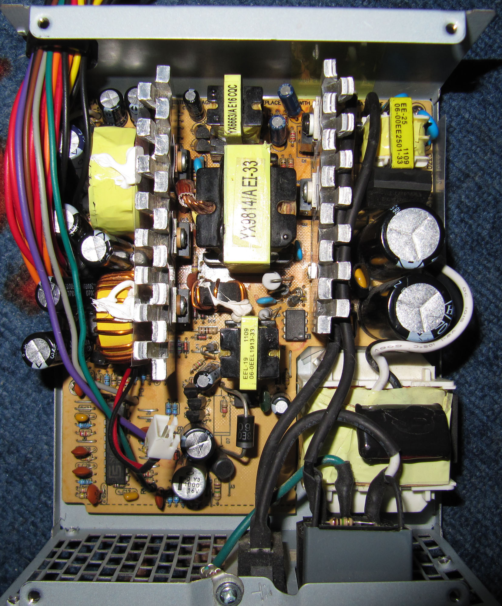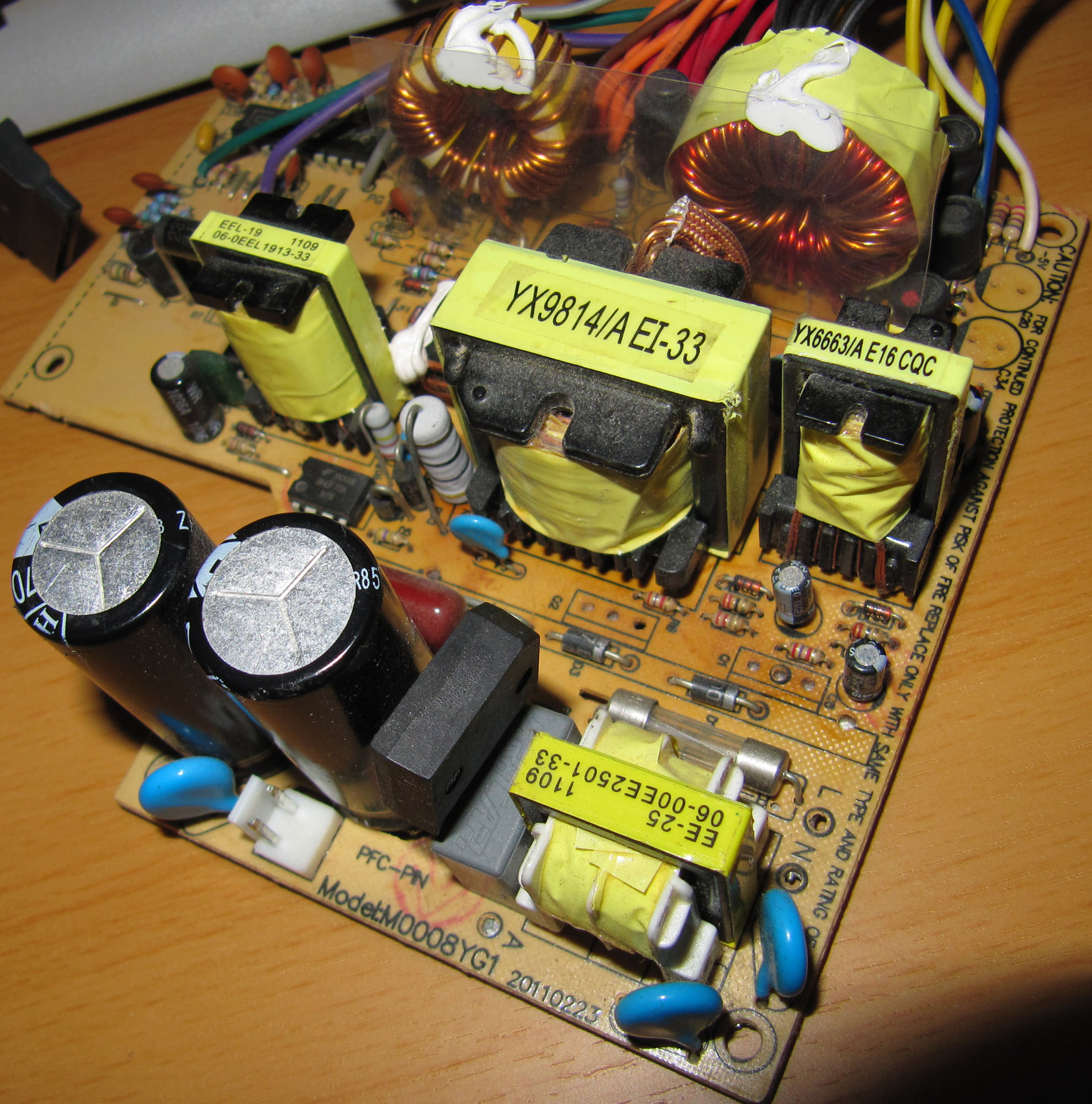 Input caps are 2x HEC 470uF 200V, their real capacitance is 452uF. The main transformer is ERL-33 and the switching transistors are 2x13009 but in TO-220 package. I would say it is a 250W unit.