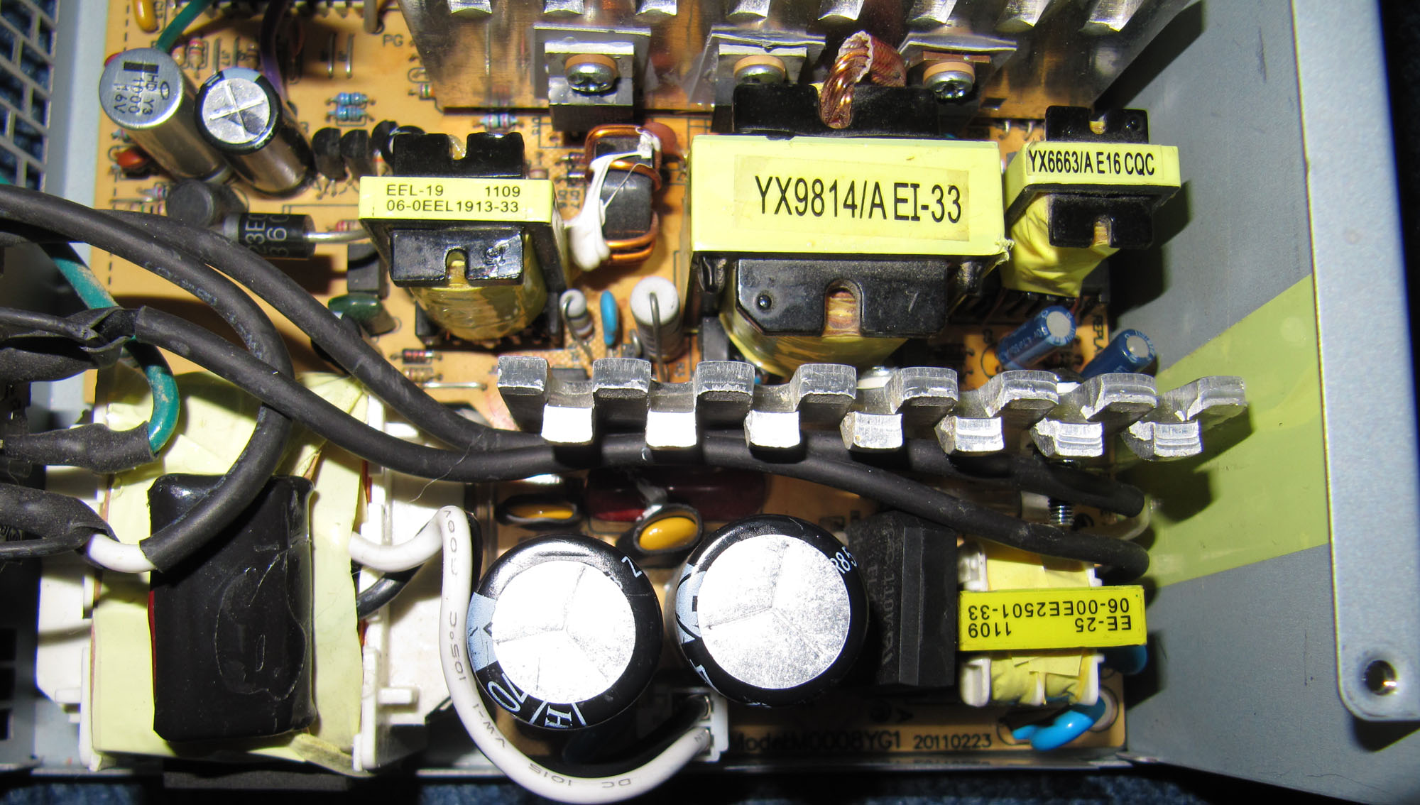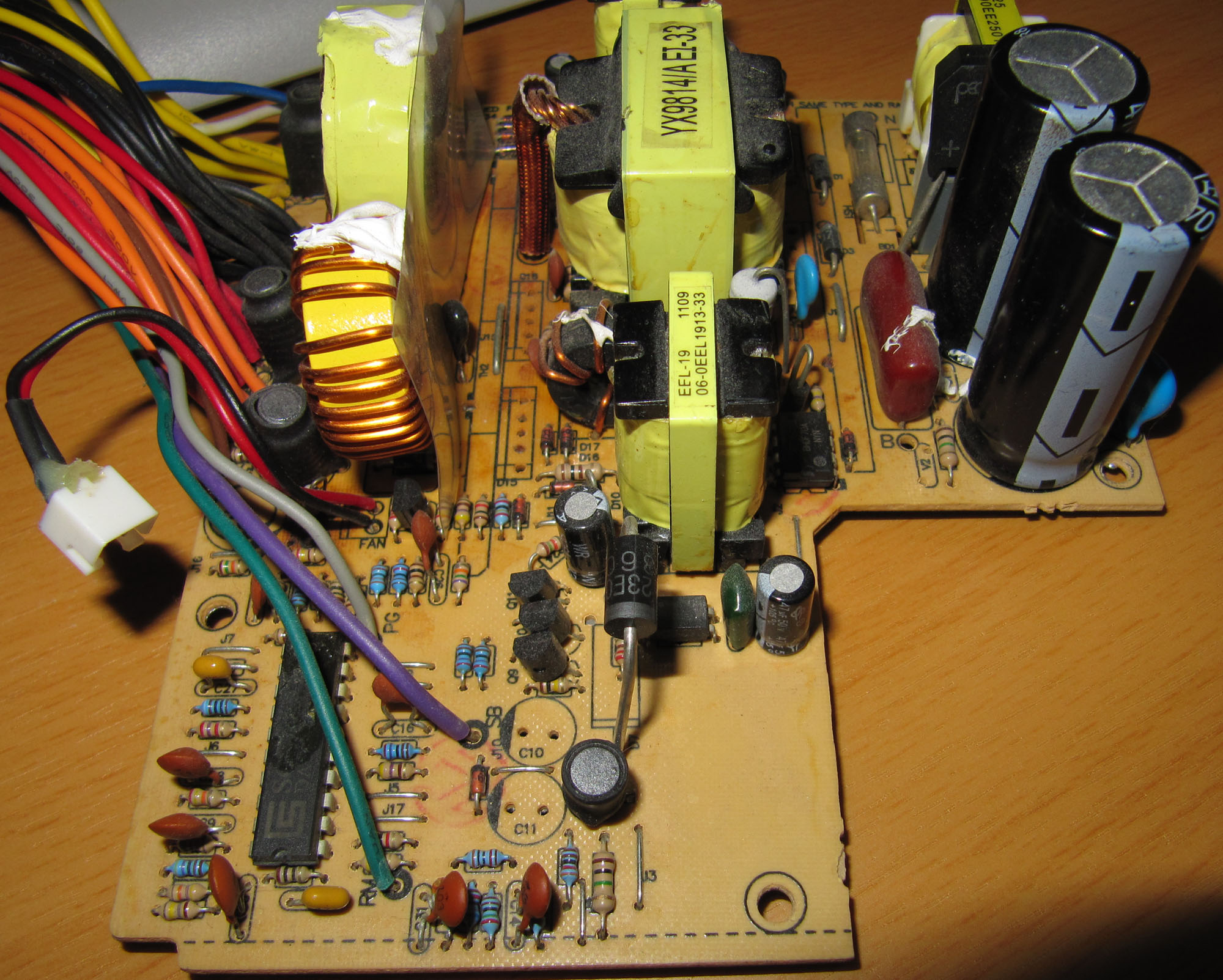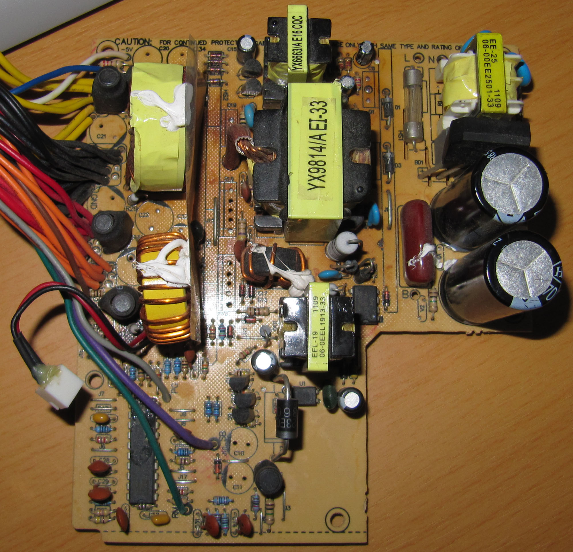 Input caps are 2x HEC 470uF 200V, their real capacitance is 452uF. The main transformer is ERL-33 and the switching transistors are 2x13009 but in TO-220 package. I would say it is a 250W unit.