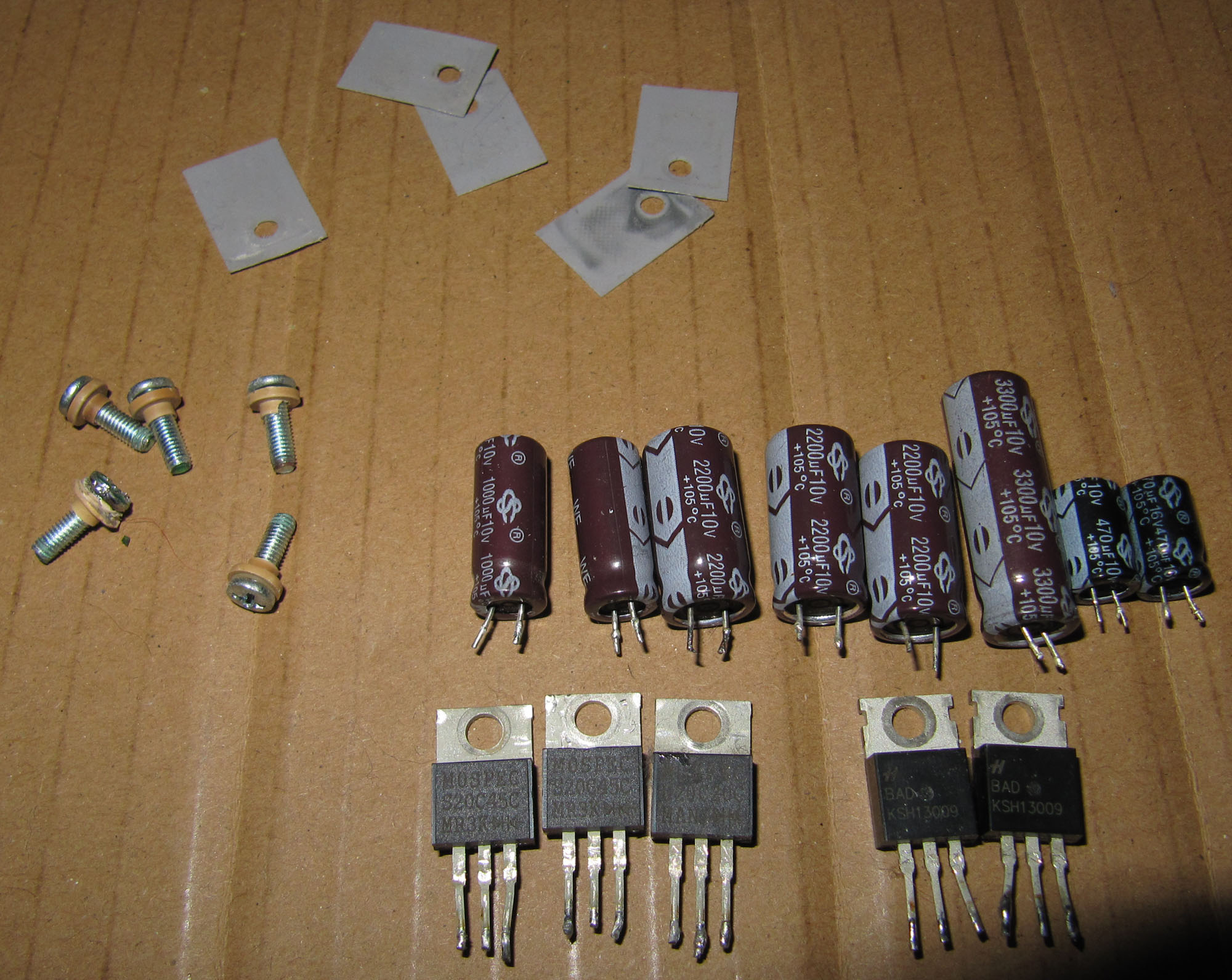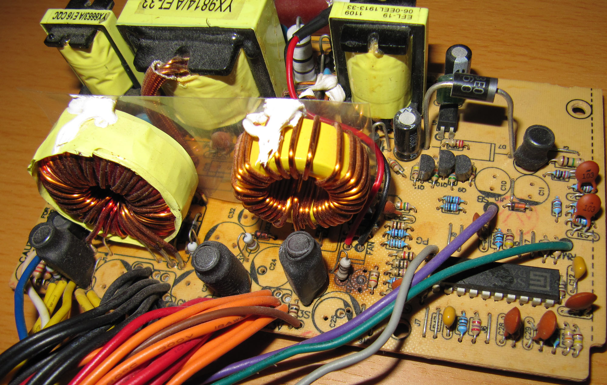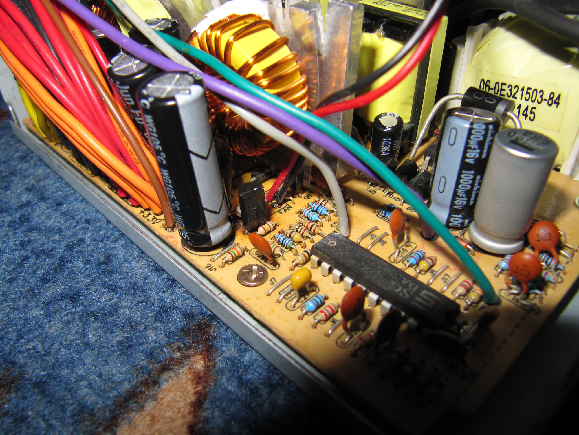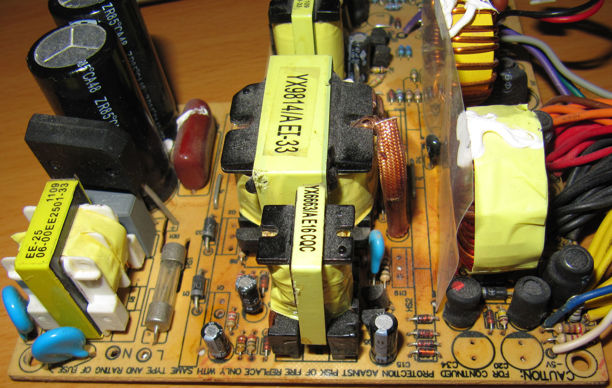 Input caps are 2x HEC 470uF 200V, their real capacitance is 452uF. The main transformer is ERL-33 and the switching transistors are 2x13009 but in TO-220 package. I would say it is a 250W unit.