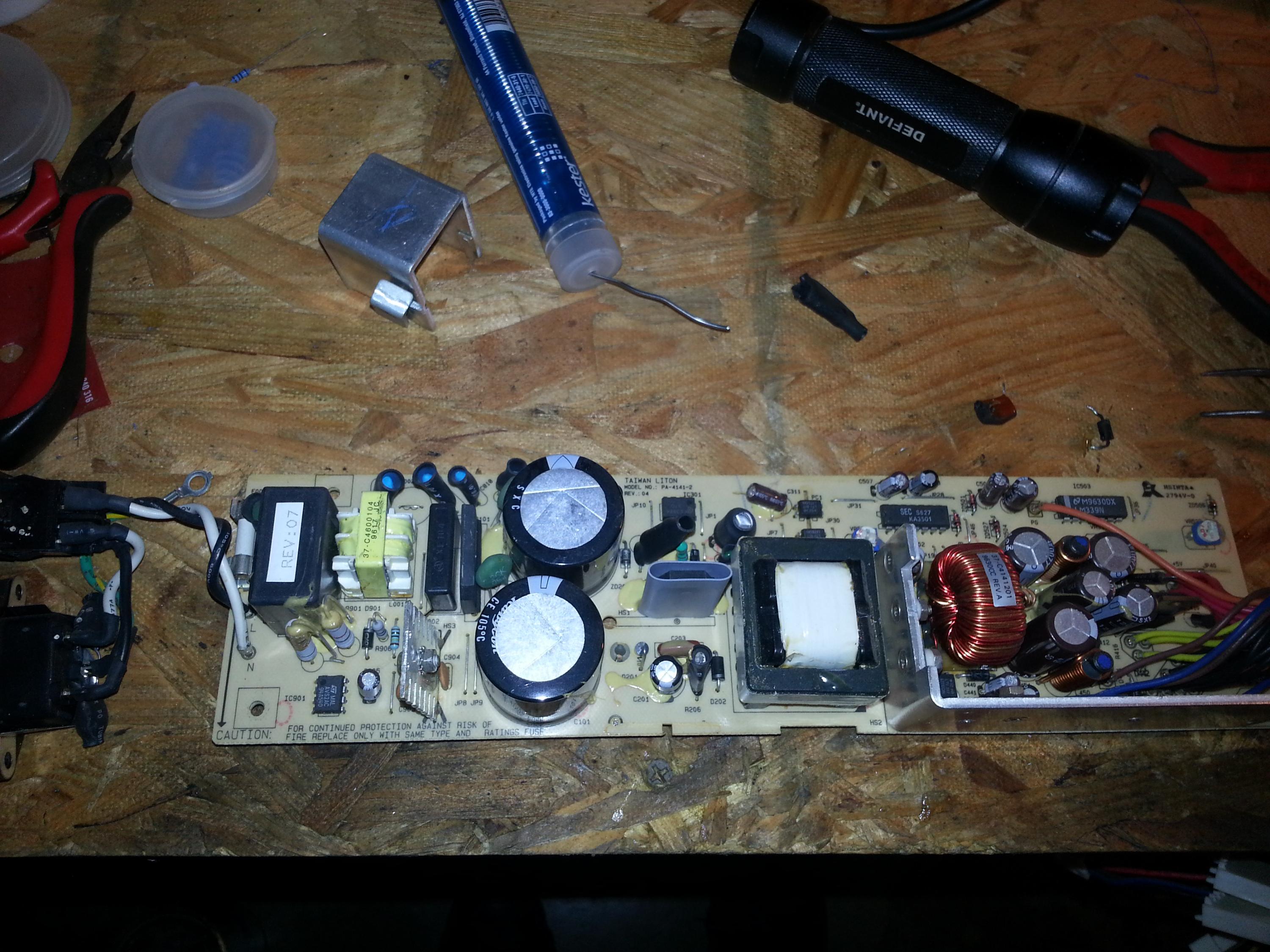 So I haven't powered this machine up for some years, but when it powered it off last, there were no problems. Before powering it up, I opened up the machine and blew it out with compressed air. Everything was clean. So I plugged it in on turned it on. BZZZZZZZZ! Turned it off. Opened the machine, pulled the power supply, hooked up the PS to AC with no load. FIRE! Turned it off.