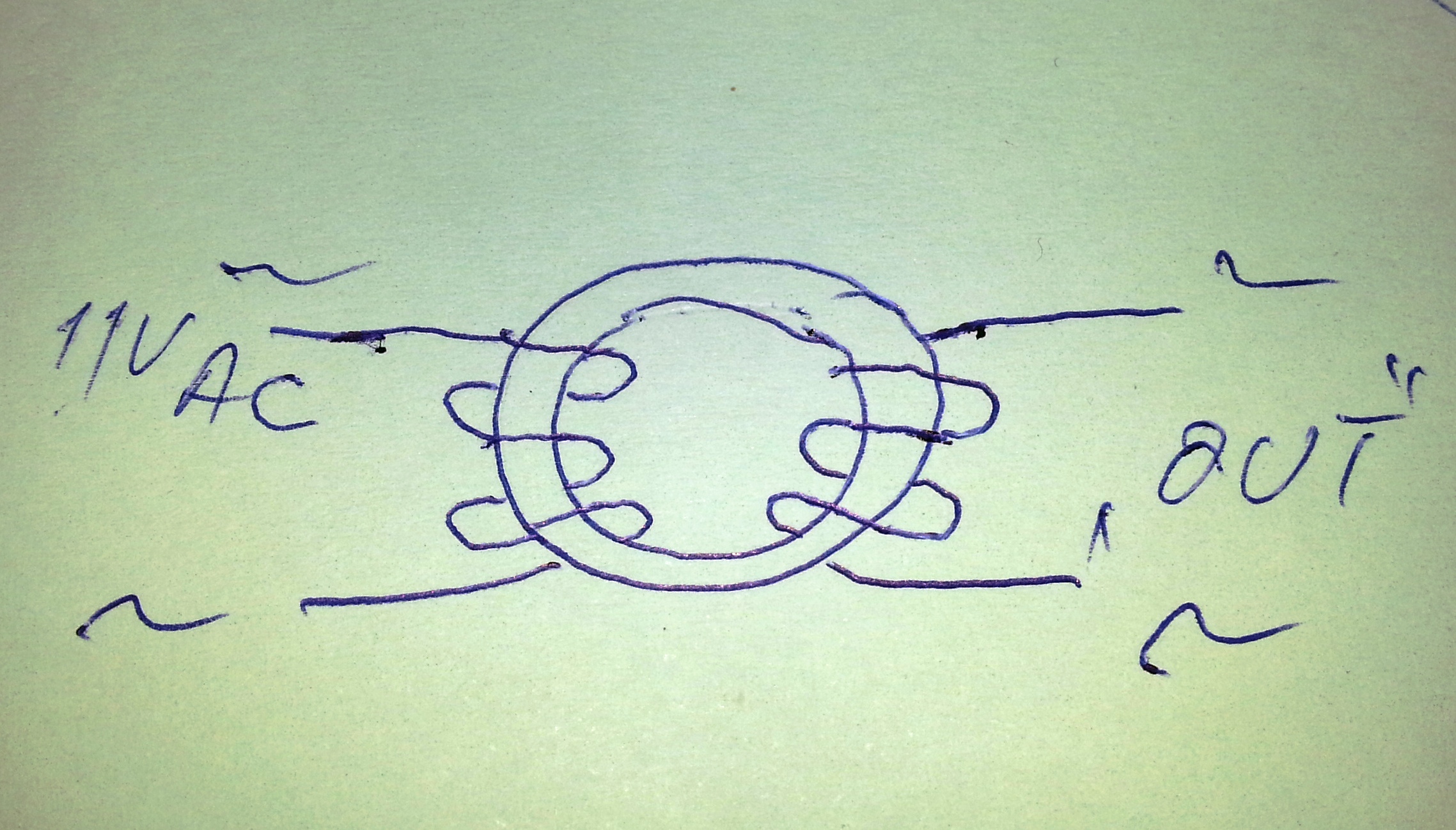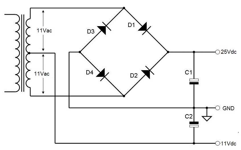 Now the transformer he got isn't quite a perfect match: it's a center-tapped transformer with two 11v windings, instead of two separate ones, so to work around that, I suggested connecting the outer "ends" to the rectifier to give us the 20v we needed for the output and then power the instruments with the center tap at 11v, as per the schematic attached (ok, the actual values are higher than that, but let's assume it's ideal). It works, the voltage adjusts up and down and it's within spec, but there's one problem: the ammeter doesn't read correctly. It's way off, by like half an amp, so if I load the output with 1a, the meter only reads like 0.34A !