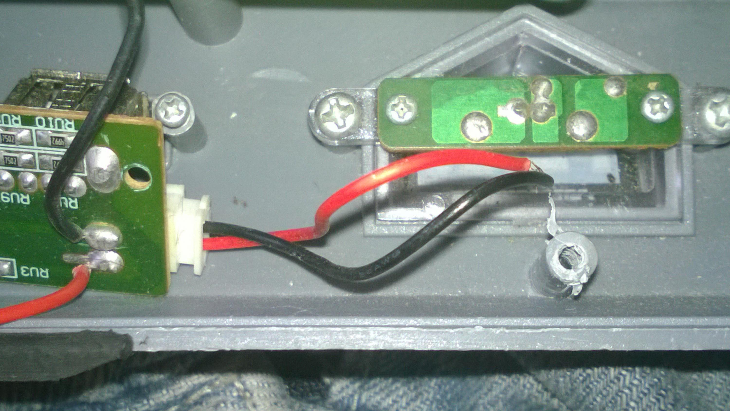 In these pictures you can see the board with the USB ports and the unattached red cable on the left. On the right you can see a connector with a pair of smaller red and black cables detached from other board. That board measures about 3\4 inch long, as you can see in the last picture, and is only a status light with the brand logo. For that one I can use the diode testing mode in my multimeter to find out the polarity of the diode. I hope this helps.