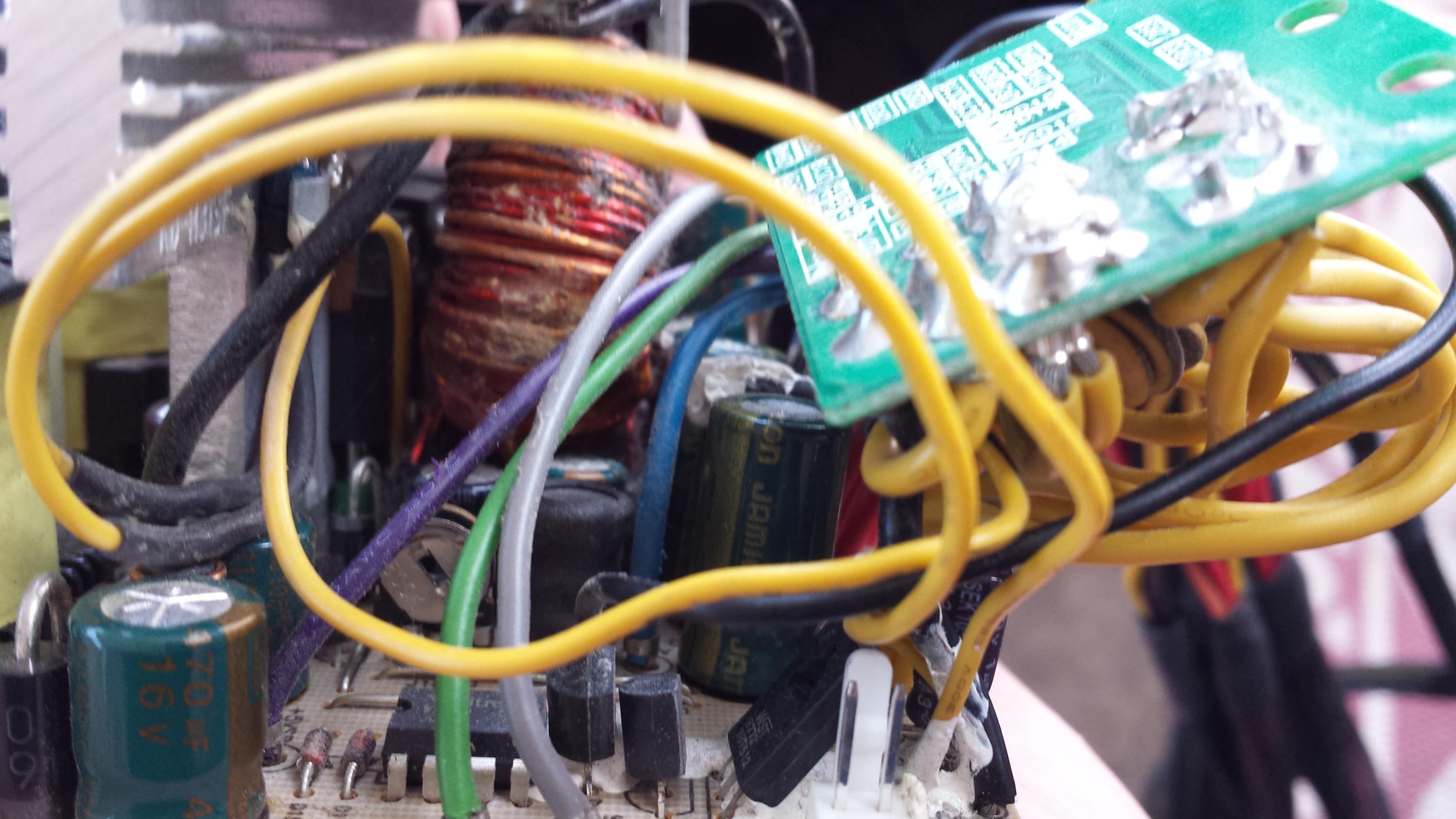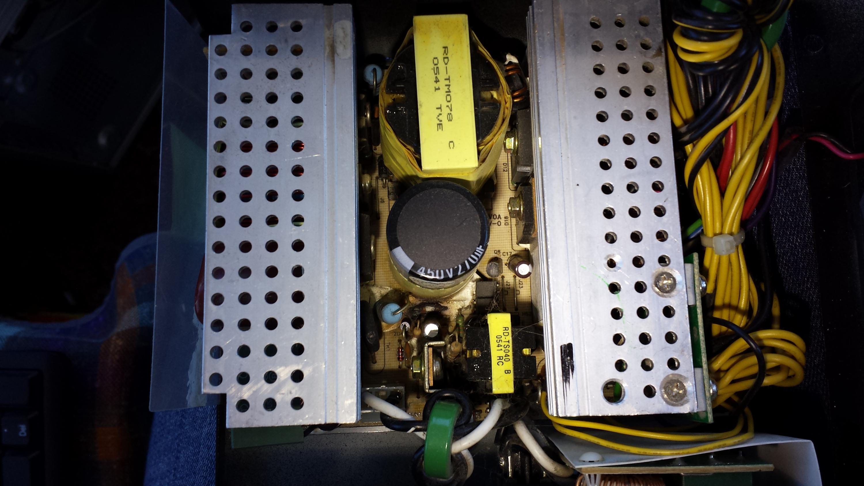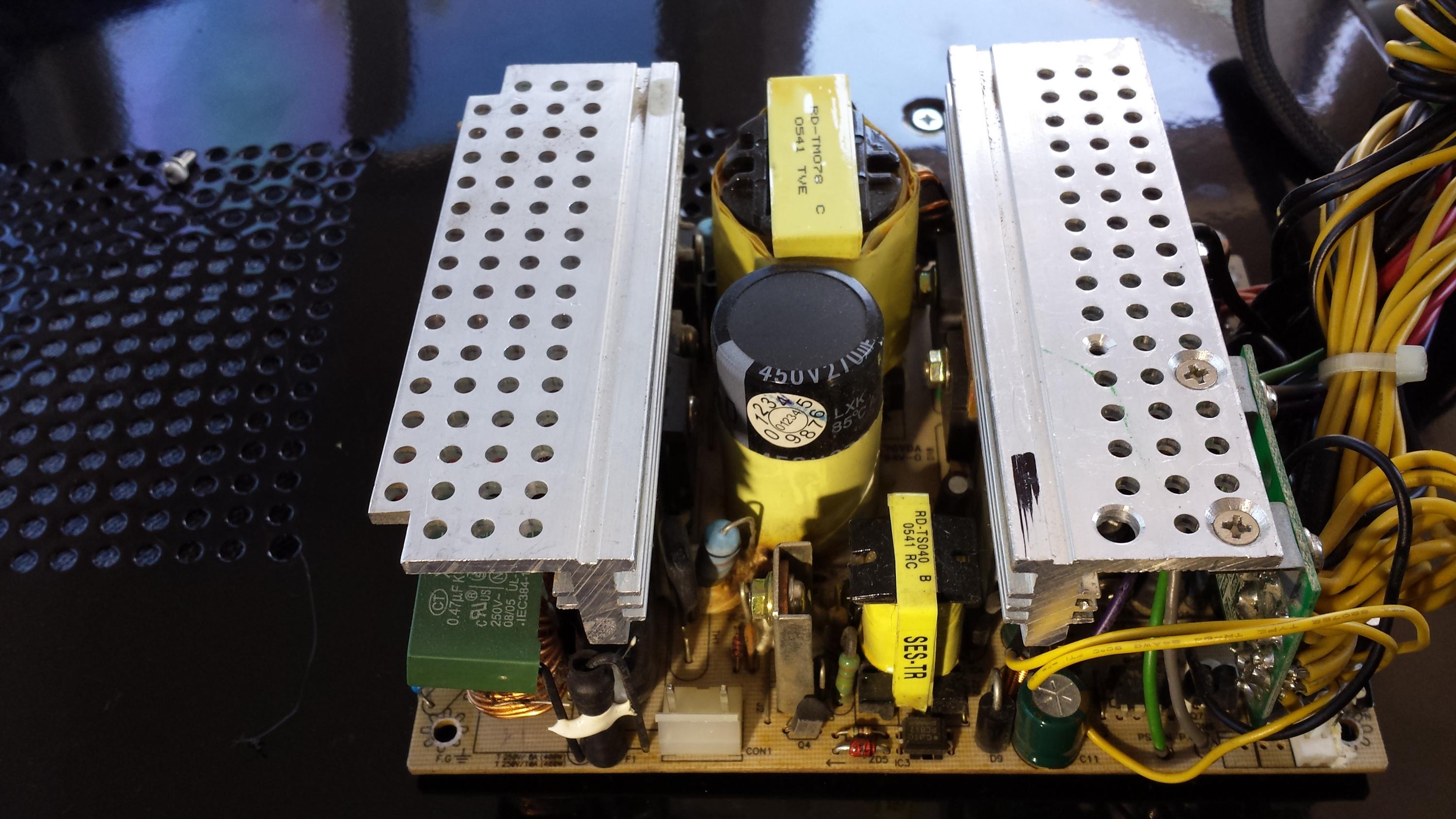 This is some old power supply, it stopped working (didn't power on) several years ago. Bought new replacement. Recently I needed some psu for temporary built non important stuff. Bringed up this psu, replaced a few bulged caps. PSU is kinda working now, voltages reported from motherboard are o.k. (except some strange usb disconnect problems if more than few devices are plugged in), sometimes psu didn't turn on by pressing button but only manually connecting green and black wires.