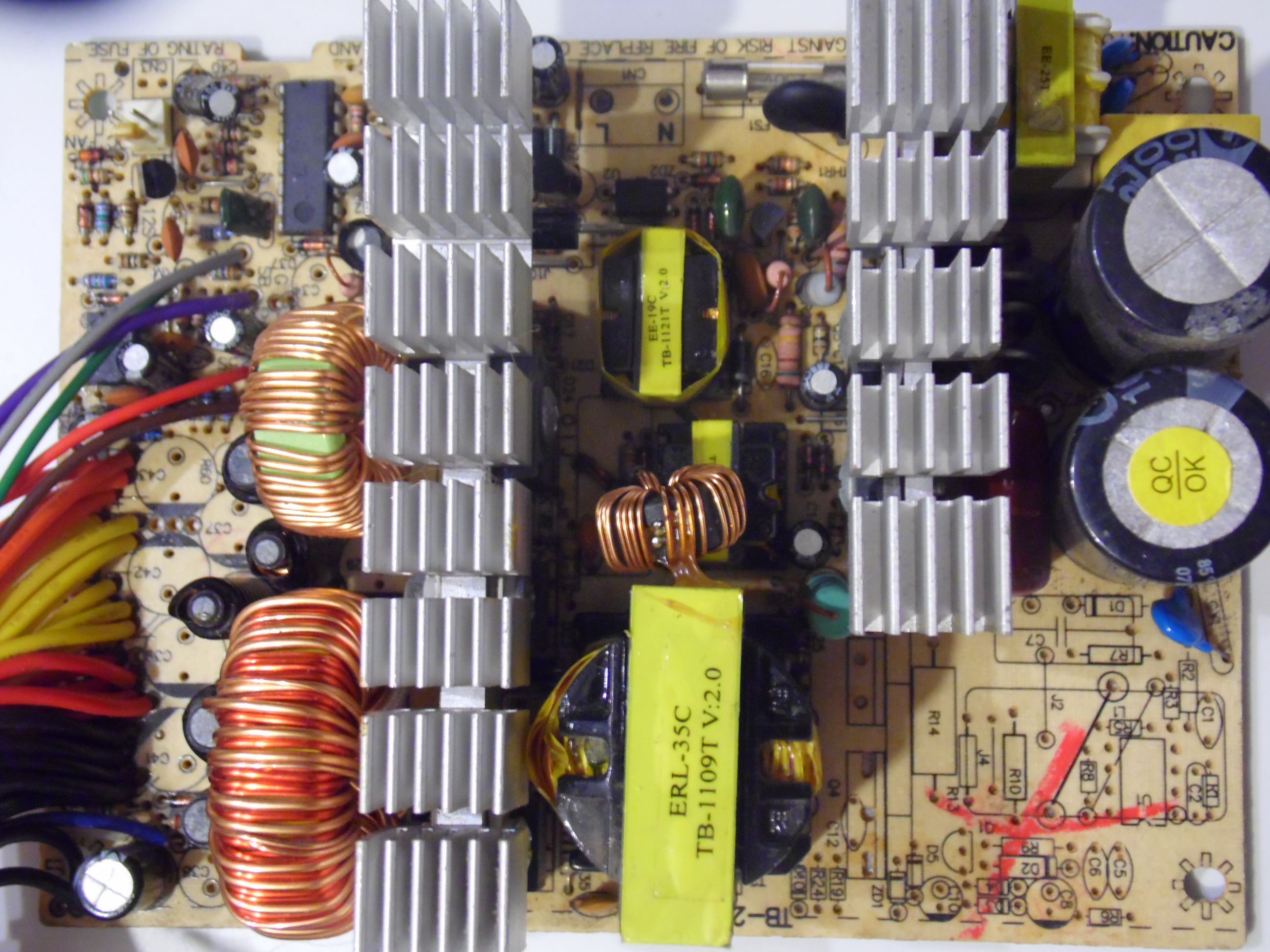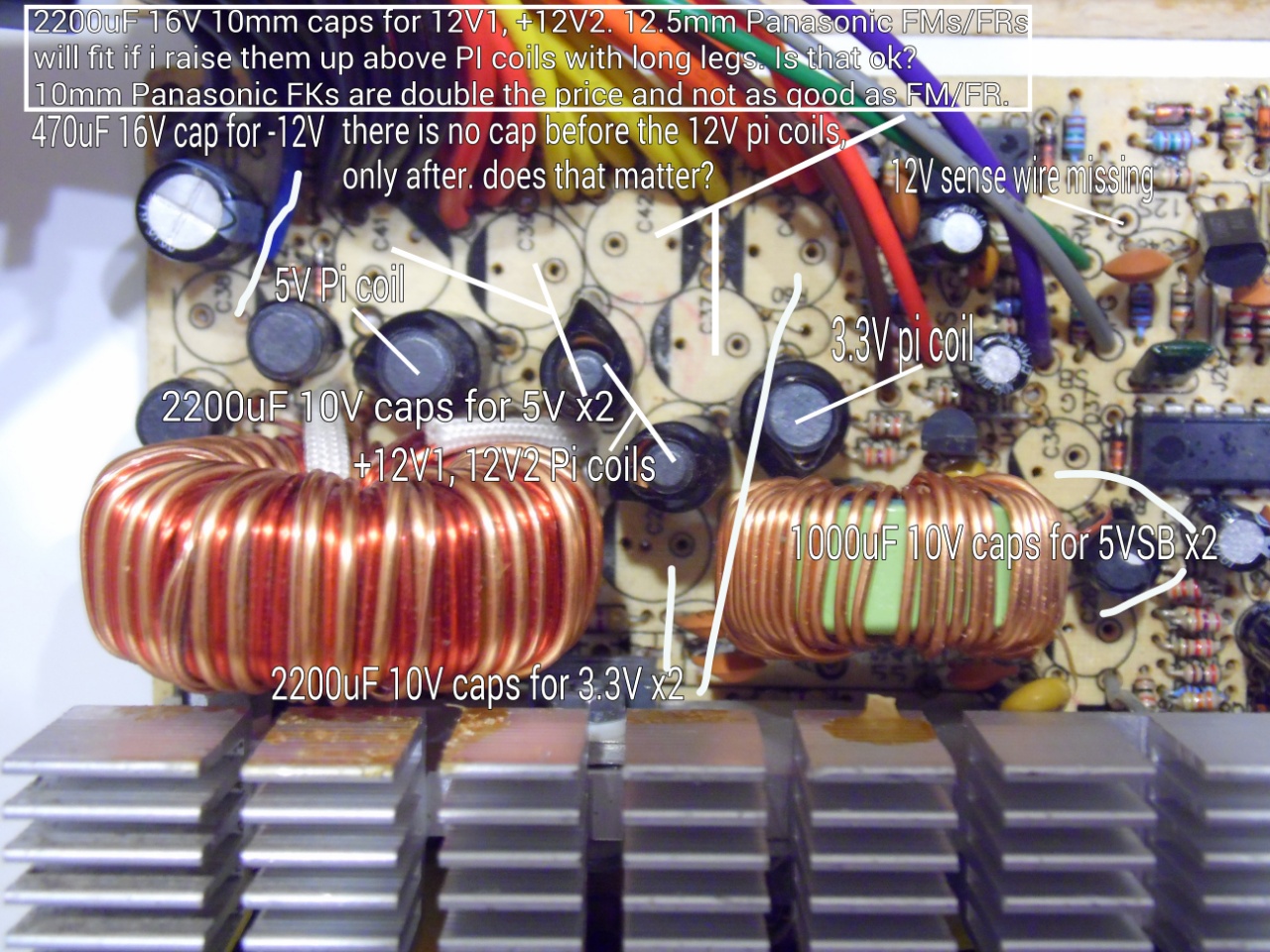 The 5V and 3.3V output caps were all 2200uF 10V fukyuu's and were visibly bulging. I intend to replace these with 10mm 2200uF 10V panasonic FRs.