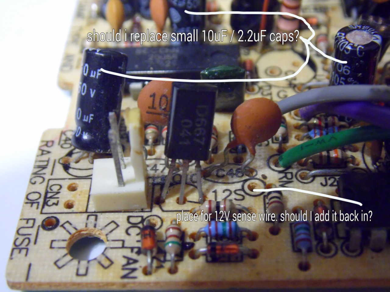 The output caps were 2 1000uF 10V fukyoos, which were not bulging but I'm going to replace them anyway with 1000uF Panasonic FRs.