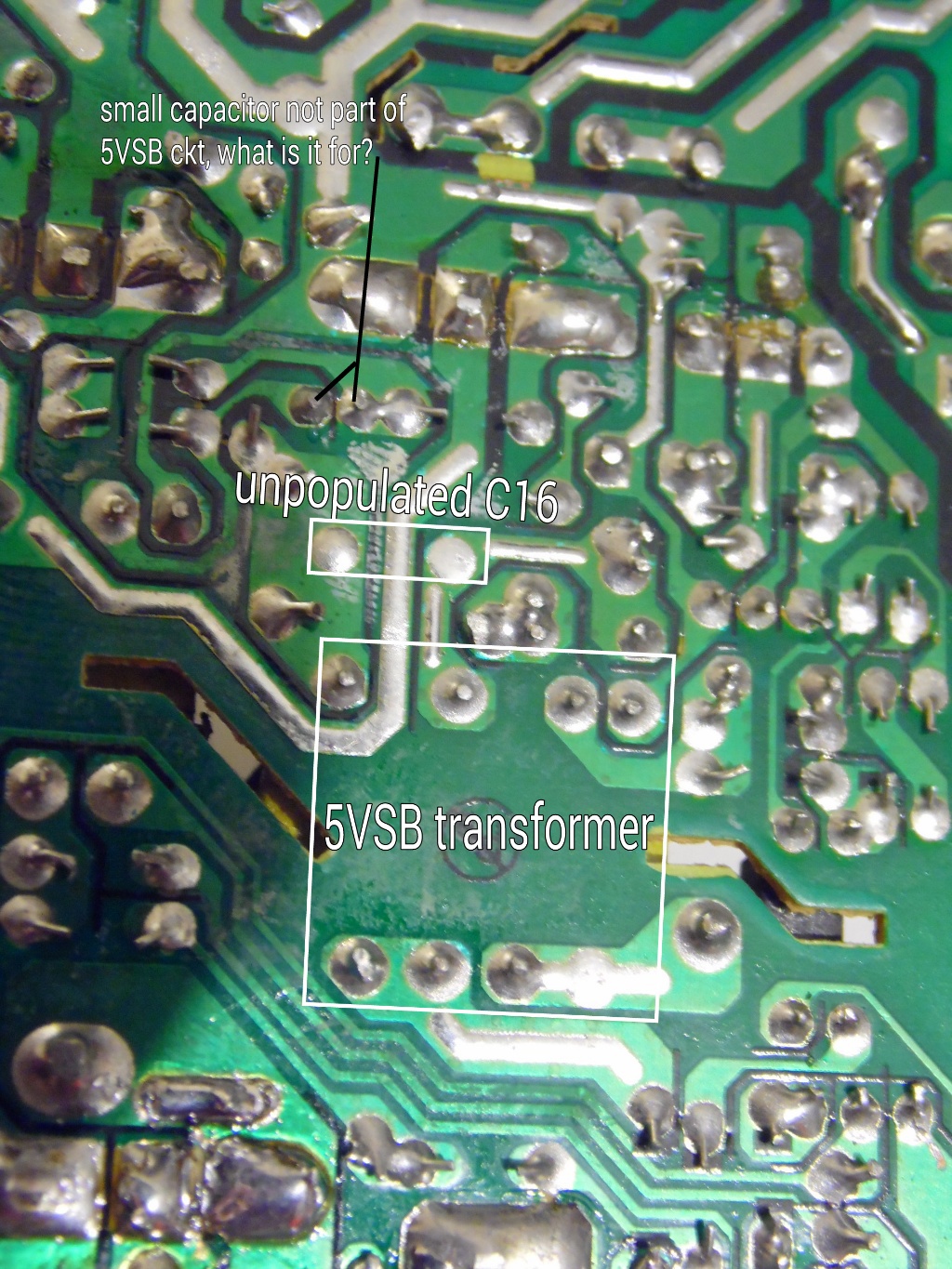 The 5VSB circuit uses the 2 transistor design but doesn't have the critical electrolytic cap that causes the output voltage to go high. There has not been any excessive overheating.