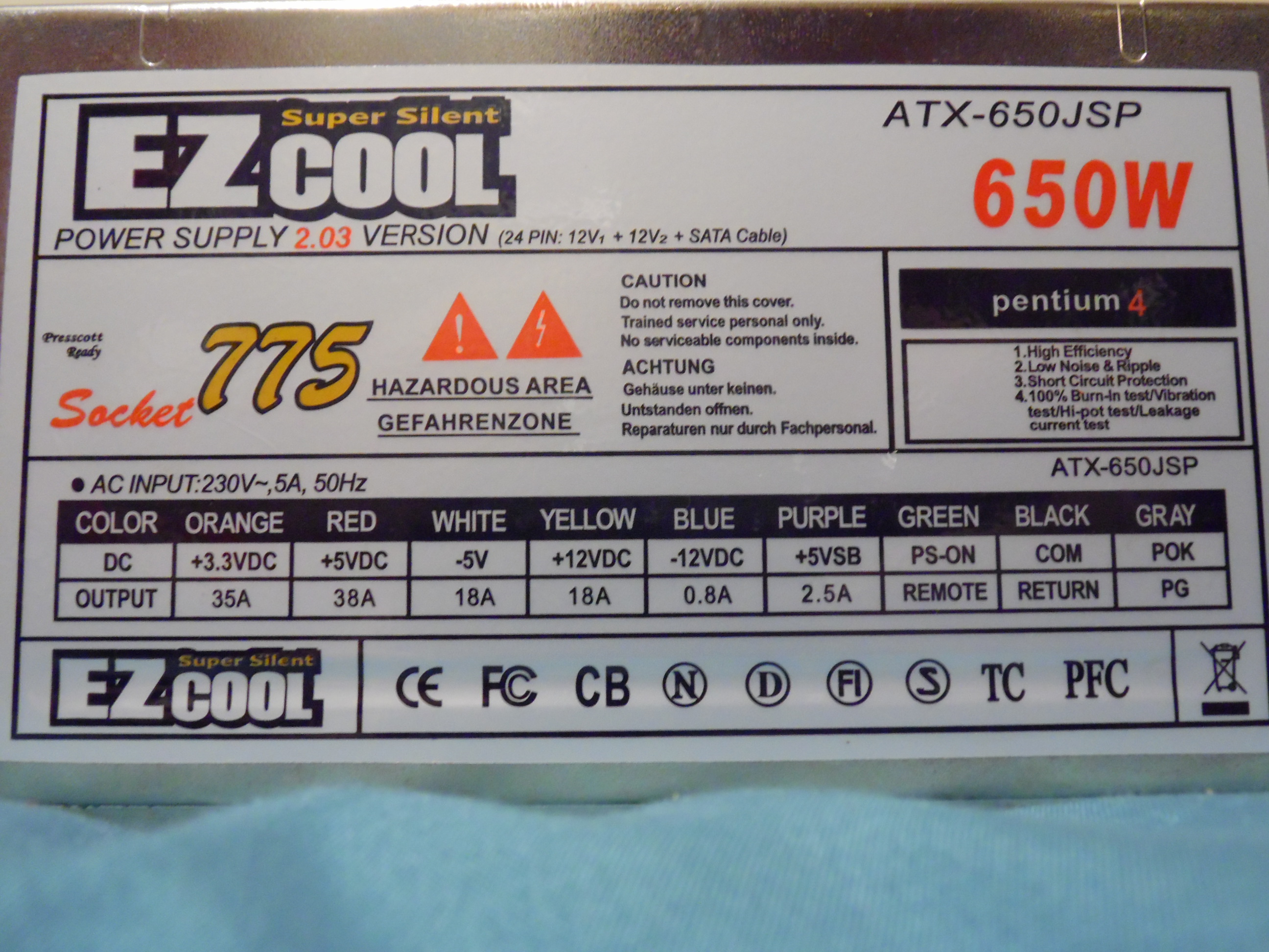 I have been given this EZ-Cool ATX-650 JSP. I don't believe that it is actually capable of 650W but it seems reasonably well built with a decently sized transformer and heatsinks.