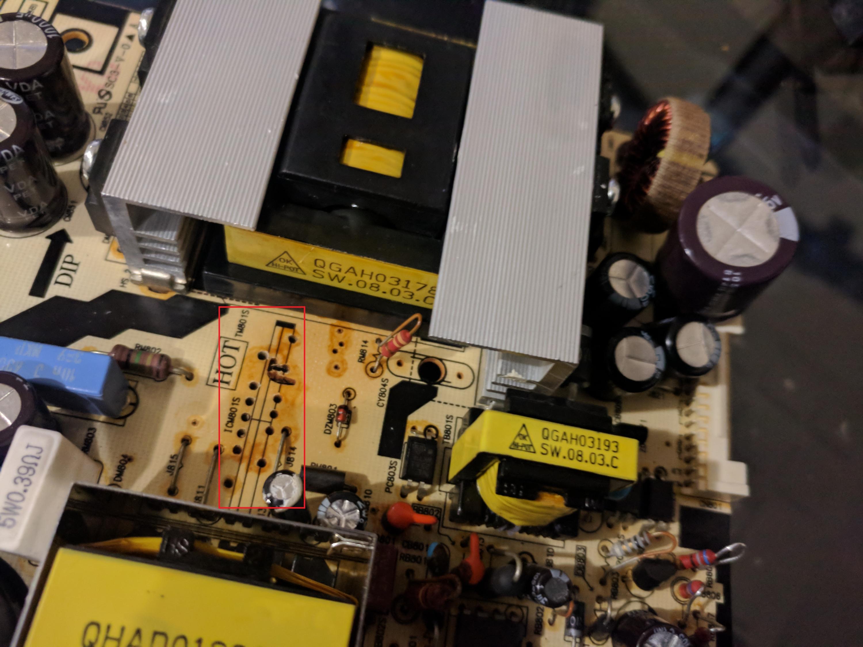 This circuit NEEDS to work as it gives the 5 volt standby to the main board. AND it supplies the VCC via the 3 resistors and QB803 to the ic (ICM801S) you removed.