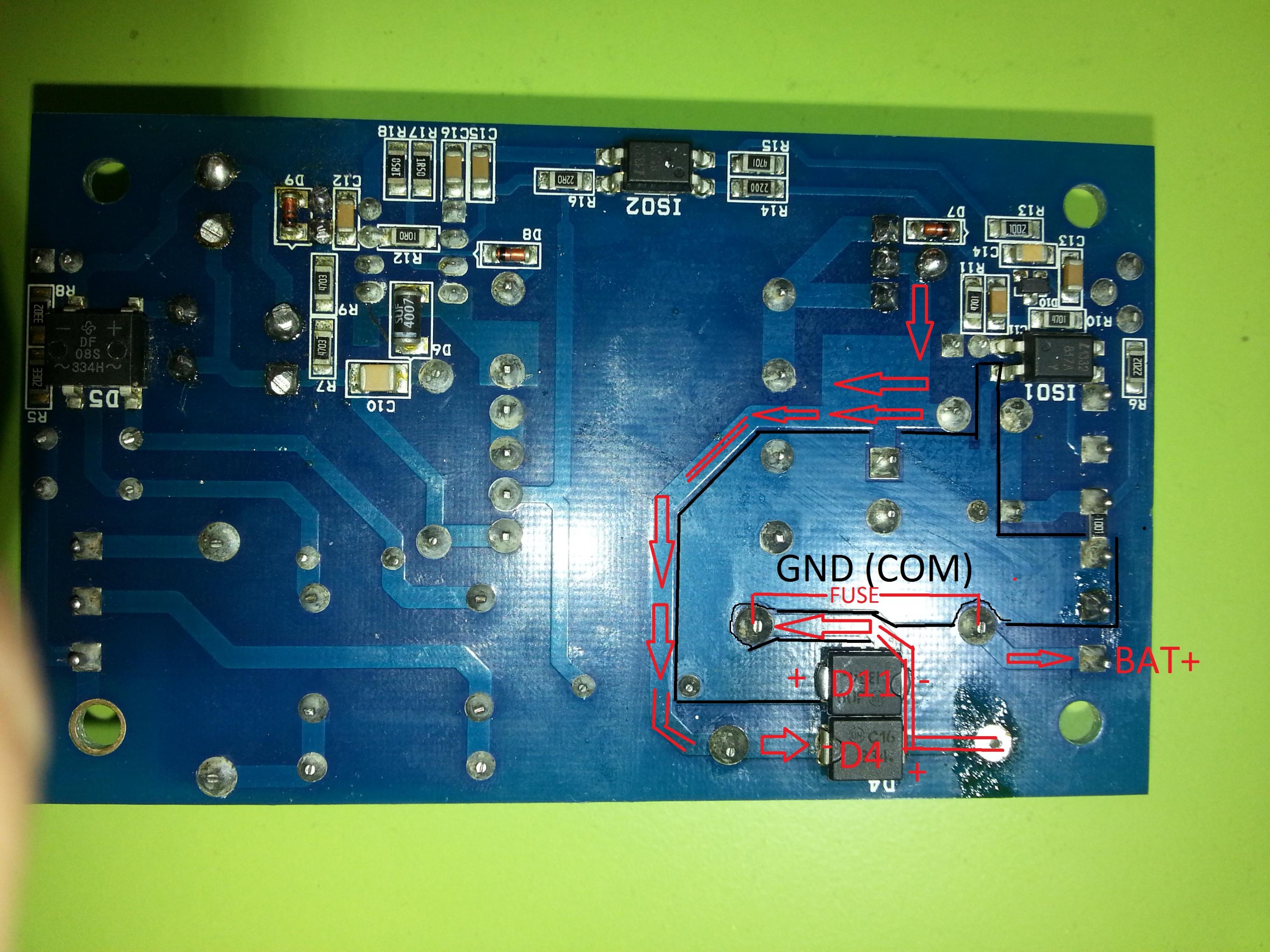 When I got it, the power LED would flash intermittently as if there's a high load on the output or a short. I found D11 shorted - it is the reverse polarity protection diode which forward-biases if the battery is connected in reverse by accident, blowing the fuse (the fuse is housed inside that black box on the secondary side). I replaced it, the supply now turned on without a battery attached, but when I connected a battery, it went back to blinking again. Turns out the adjacent diode, D4, was ALSO shorted. It's paralleled with that large ceramic 10ohm resistor. I replaced it and it works, but my question is why is there a diode in parallel with the resistor and why the supply failed when it shorted ? I was expecting the diode to act as a wire between the supply's output and the battery, so I didn't expect it would shut off. I suppose bypassing the resistor (which is what the shorted diode did), placed too much of a load on the supply, even though the battery was new and full and I used to connect SLAs directly the output of power supplies before and never caused them to shut off, so perhaps I don't understand the principle of this one...it's only a handful of components - no current sensing as far as I can tell...the cluster of SMDs on the left is for feedback.