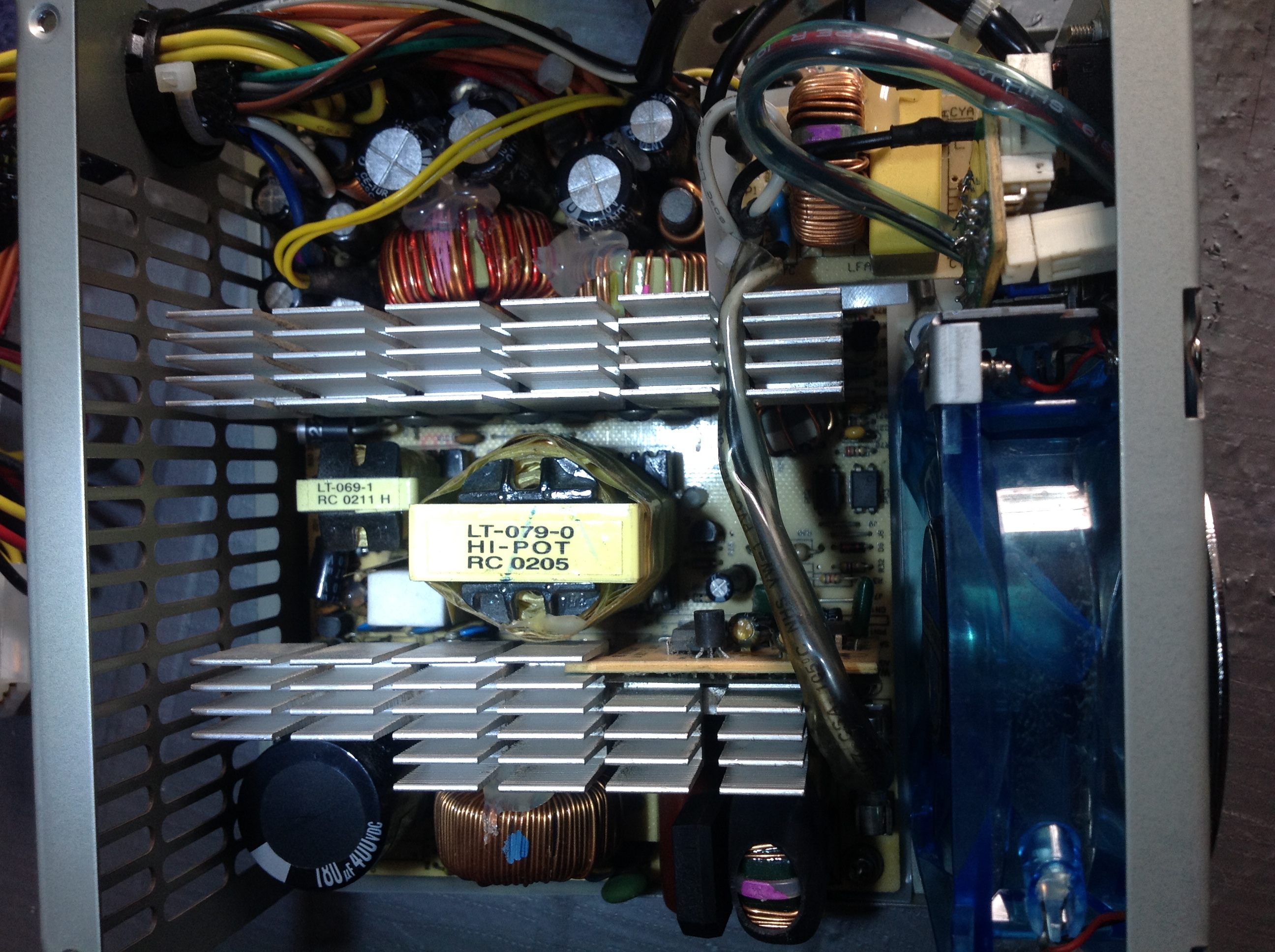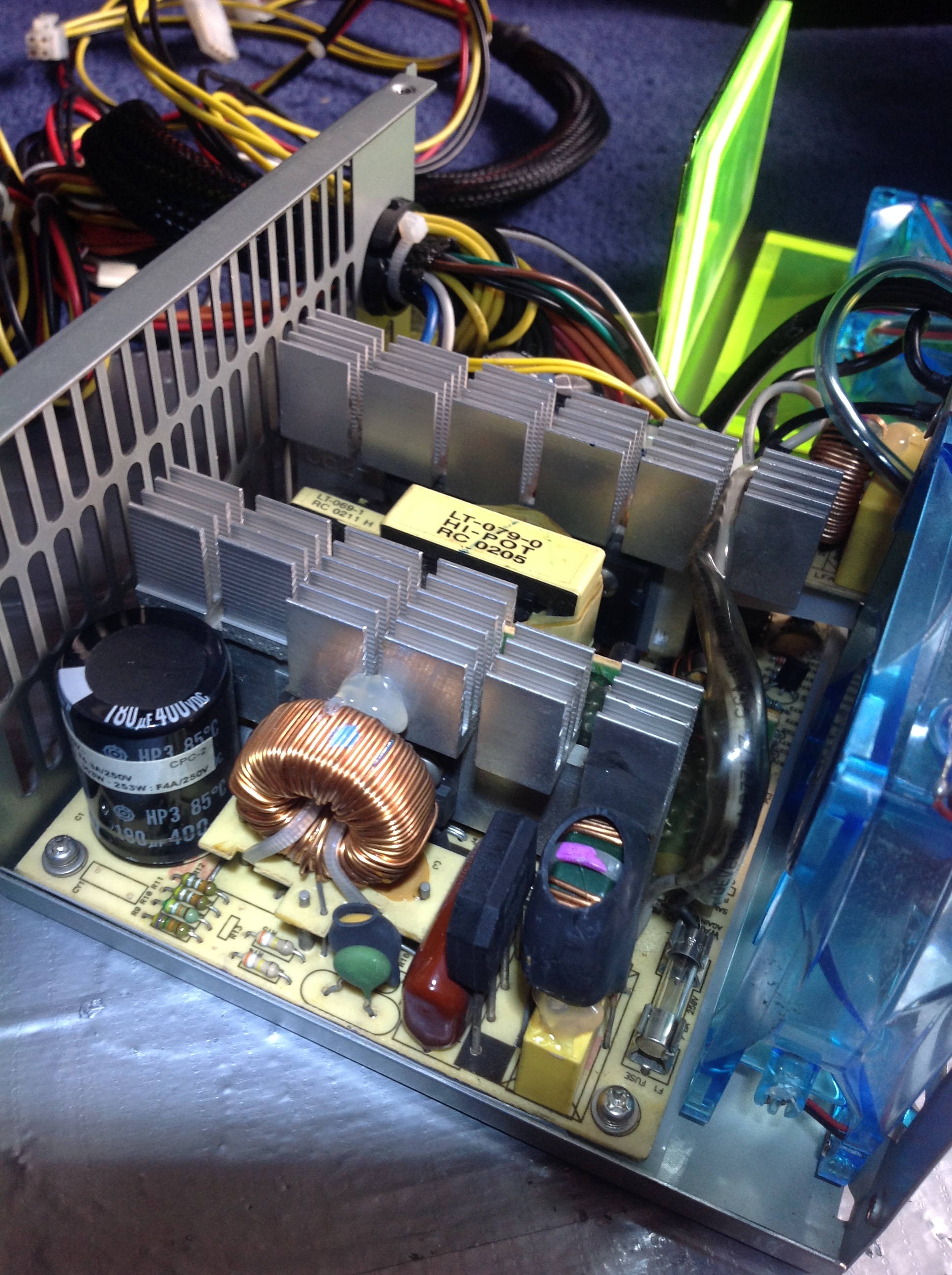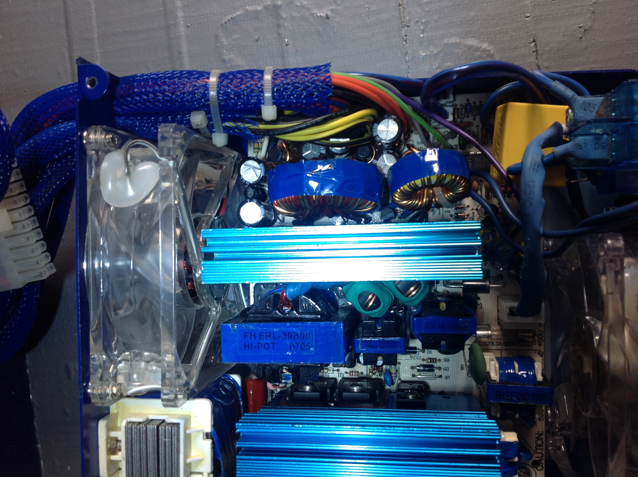 This is the atrix 650t, 650w rated psu of course it isn't 650w I know their game with this one make the user think that the psu is good by its looks and put them off the quality of the internal psu board, it can do around 400w on a good day. It has a clear Polly acrylic case with two 80mm led fans that can be controlled by the potentiometer at the back, its of an ok quality I recapped it due it having sancon outputs causing bad ripple, Im sure I will find some use for it in a low end rig some day.