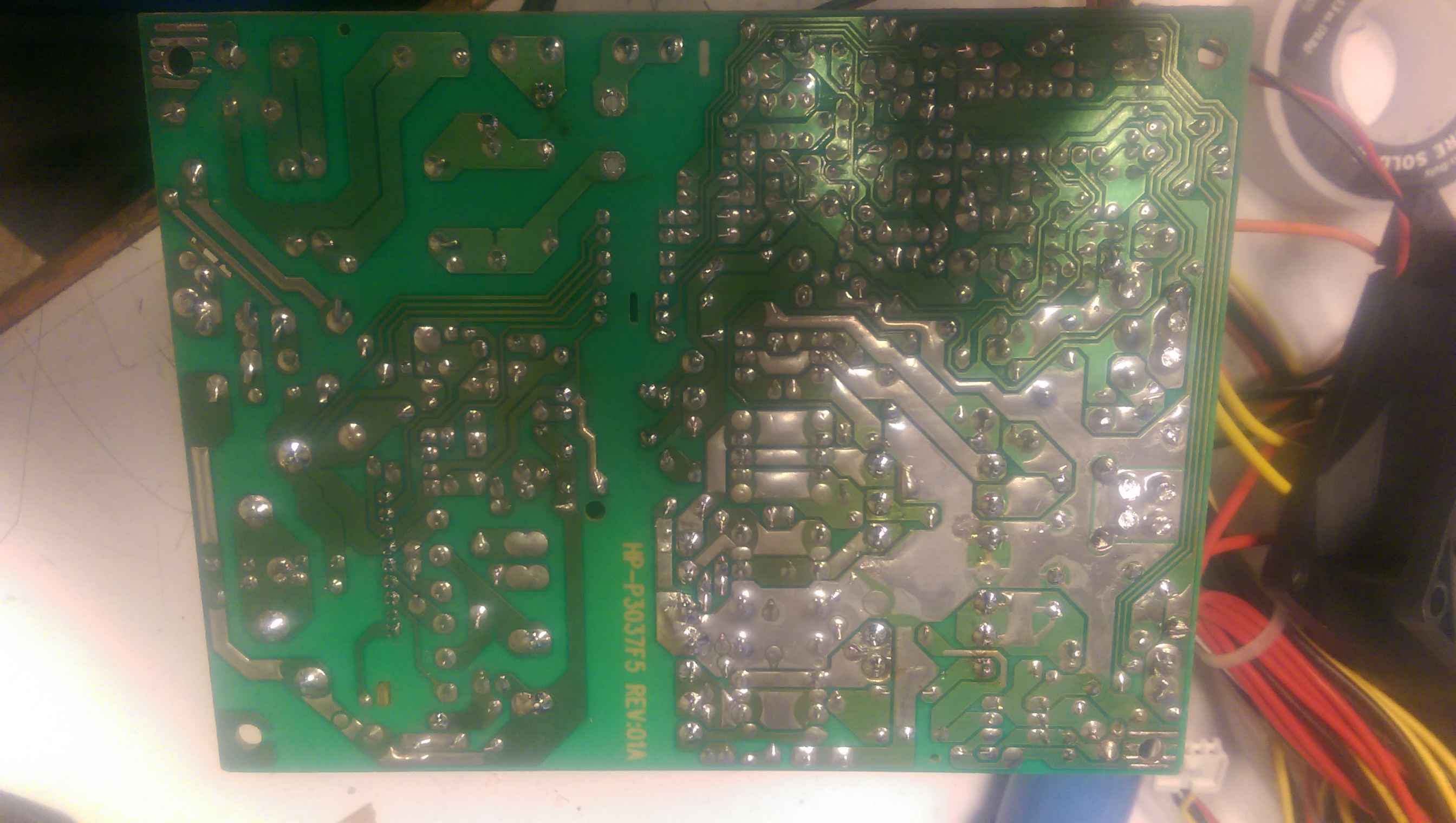 As far as removing the conductive glue goes, you missed some spots on the flyback transformer. And you recapped the Teapos with Fhys? Not exactly an improvement besides bulk capacitance but since it's in the voltage doubler you'll get away with it. And yes, that Hipro is silkscreened for another model, the 250W version of it, as stated. This exact model is actually based upon a very old design from Hipro, though, which is why it has a -5V rail. It is in fact this model, the HP-P302GF3, from 2001 (it is rated at 300W, notice... they took that design and labeled it 350W in your case). You will notice some differences in that unit, such as better ventilation, better primary capacitors, a slightly larger toroid, slightly larger heatsinks, a heavier output filter, a freestanding TO-220 rectifier instead of a single diode for +5VSB rectification, and an actual finless heatsink for the -5V linear regulator shared with the -12V linear regulator (-12V isn't linear regulated in the other units), and finally, a nice Nidec fan unlike the ADDA fans in the others.