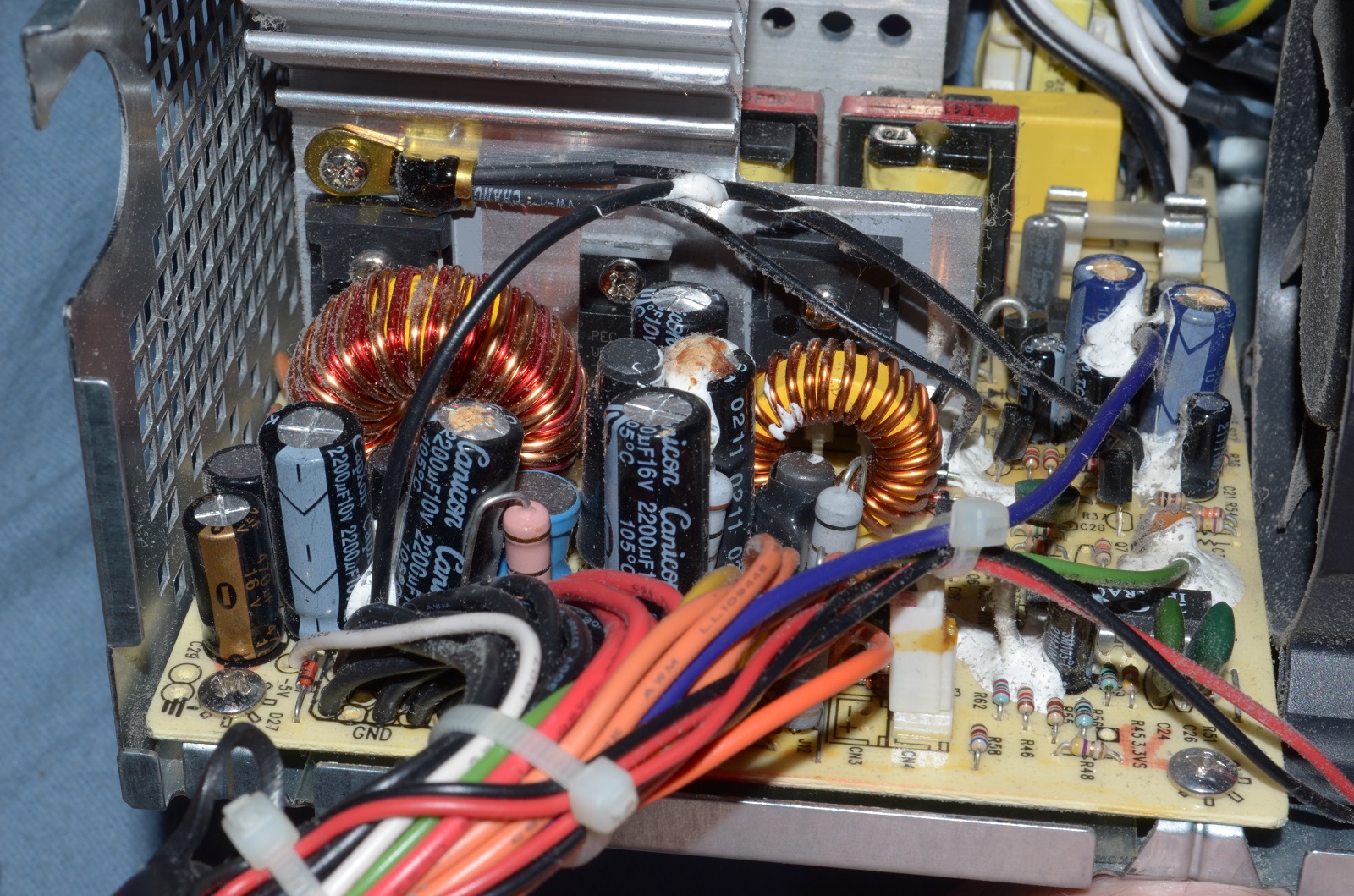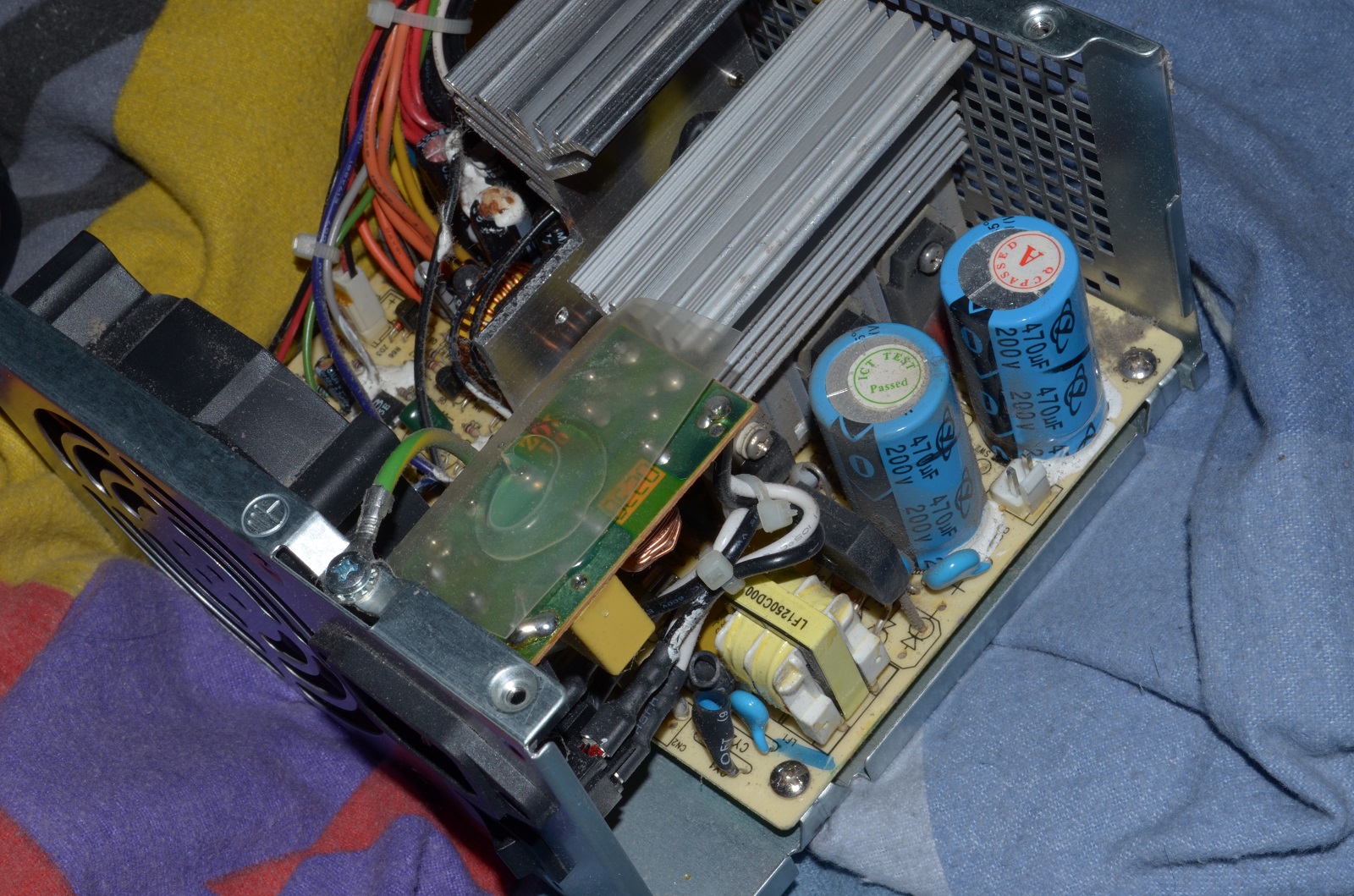 Original caps were almost all Teapo SC, but a lot of the little caps were Teapo SEK and Teapo SS. I used Panasonic FM on the 5VSB output, a mixture of Chemi-Con KY, nichicon PW, Samxon RS, and Panasonic FC for the main rail filtering, and for all the little caps, mixture of nichicon PW and Rubycon YXF