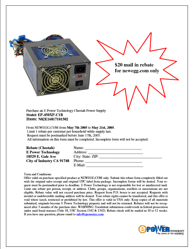 Cool, thanks for clearing that up for me. Even 8A with a heatsink probably would have been suitable in this application. It's nice to see overspeccing parts though, especially from hit or miss companies like ePower. By the way, they need to update their website SO BADLY. Look on their main web page ( http://epowertec.com/ ) under "New Product" and then when you click on "More" and then click on "Download mail in rebate form" It shows "Request must be postmarked before June 17, 2005" I attached a pic in case they take it down: