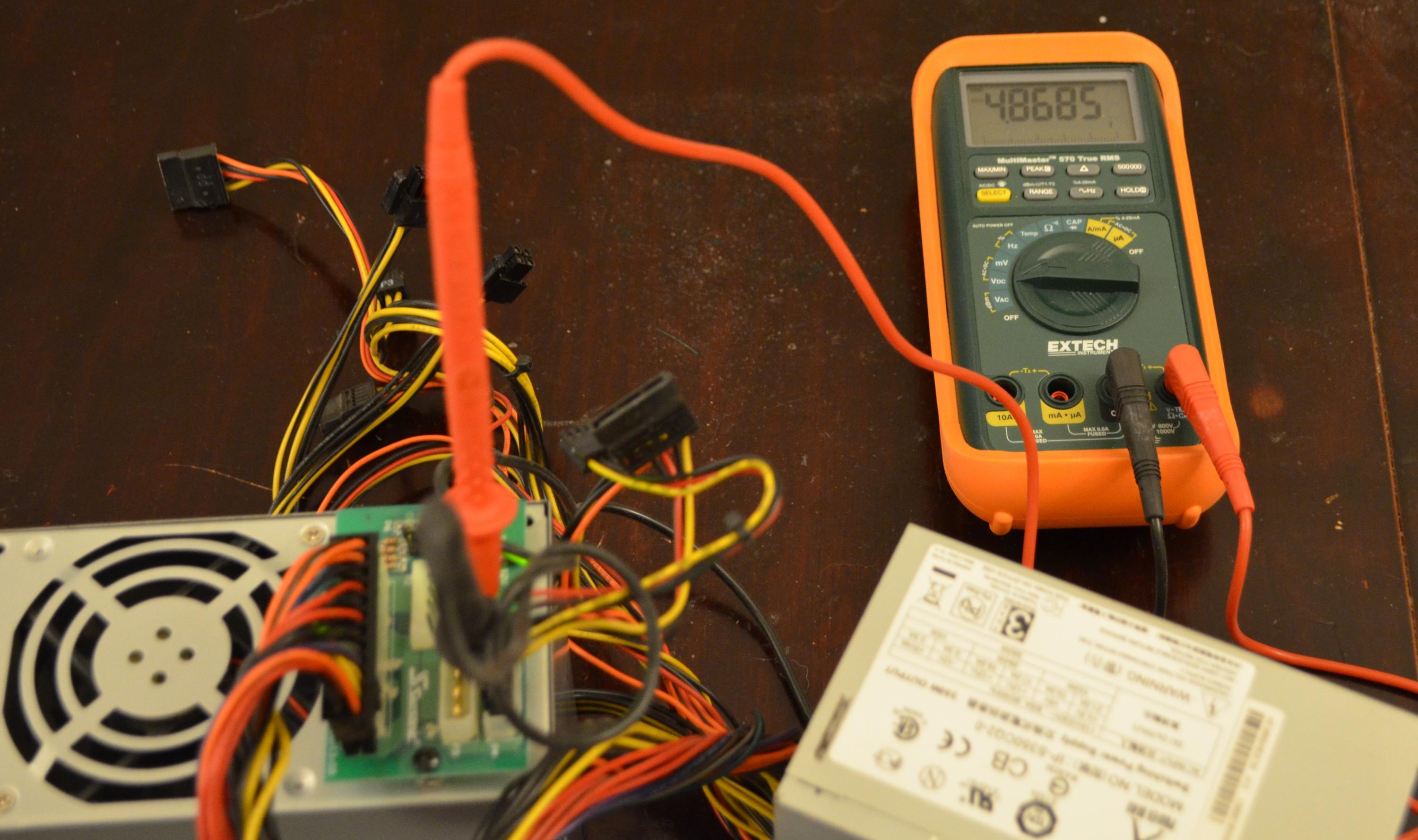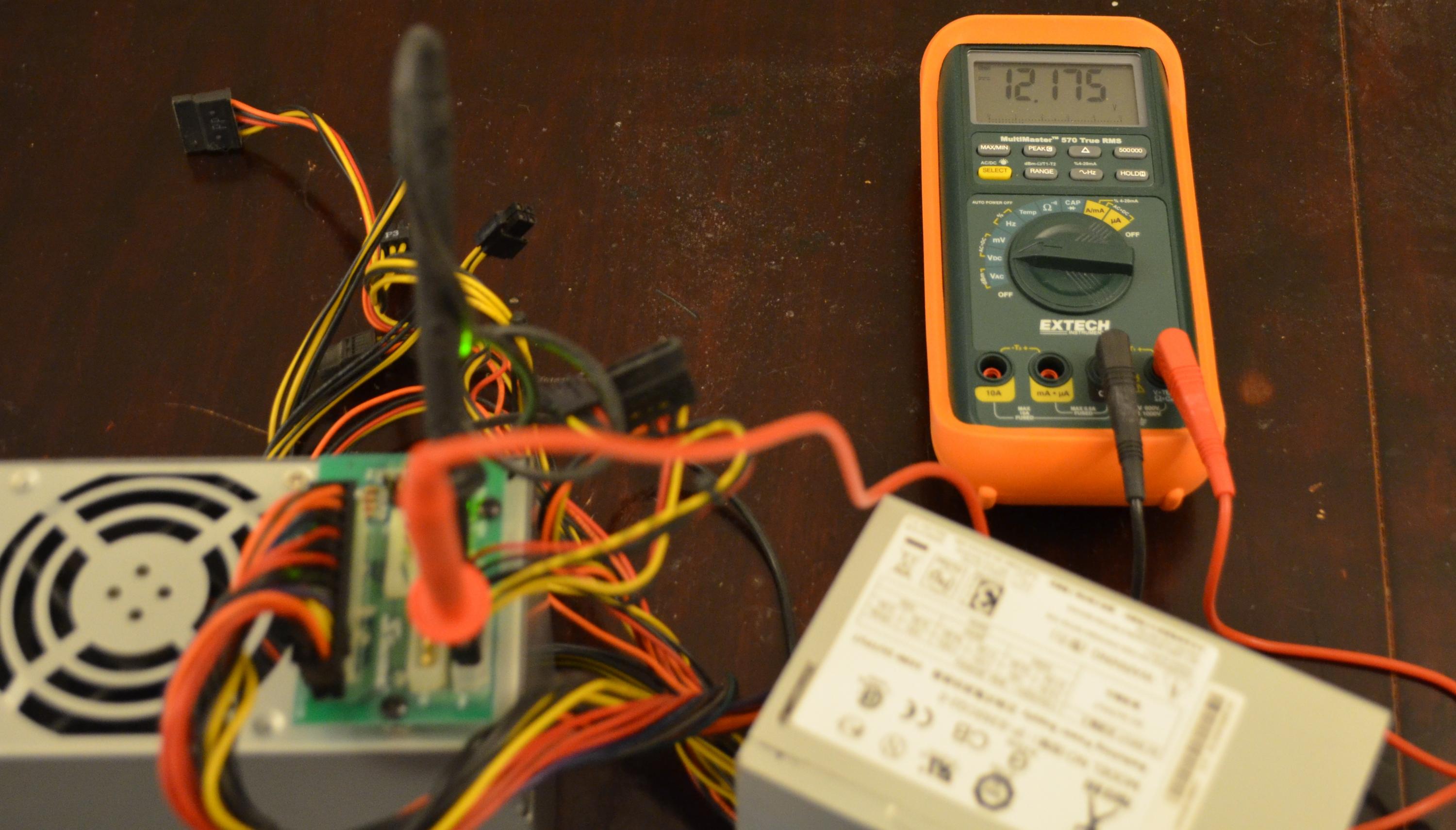Out of curiosity, I hooked these units up to an actual motherboard, for comparison here are those 2 units plugged into a motherboard running Memtest (65W TDP CPU and a GPU that is basically idling, plus keyboard, mouse, and USB DVD-RW drive, pulling around 100W from AC, so 75-80W load given the efficiency of these units)