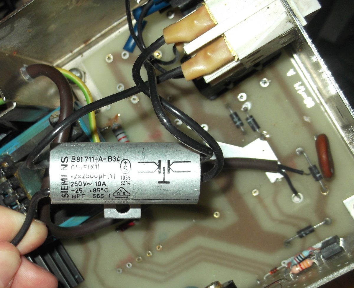 Now remember I said I got these units as “non-working”? The picture above actually shows one of the things wrong with this PSU. You see the issue? No? Then look at the orange ceramic cap just to the left of the center of the picture – there is a dark spot on it. Originally, I thought that was dust or dirt. But after cleaning the PSU from dust, I was pretty sure this cap was blown. I pulled it out and measured it. It read short-circuit. This cap is part of the snubber circuit for the 12V rail rectifier. Luckily, the series 7.5 Ohm resistor (next to it) was fine and not opened. I haven't checked the rest of the PSU for faults, but I think this is probably the only thing wrong with the PSU. While this shorted cap typically won't stop the PSU from powering on, I think it either screws up the regulation or allows massive voltage spikes to appear on the 12V rail, making whatever system is connected to it to become very unstable.