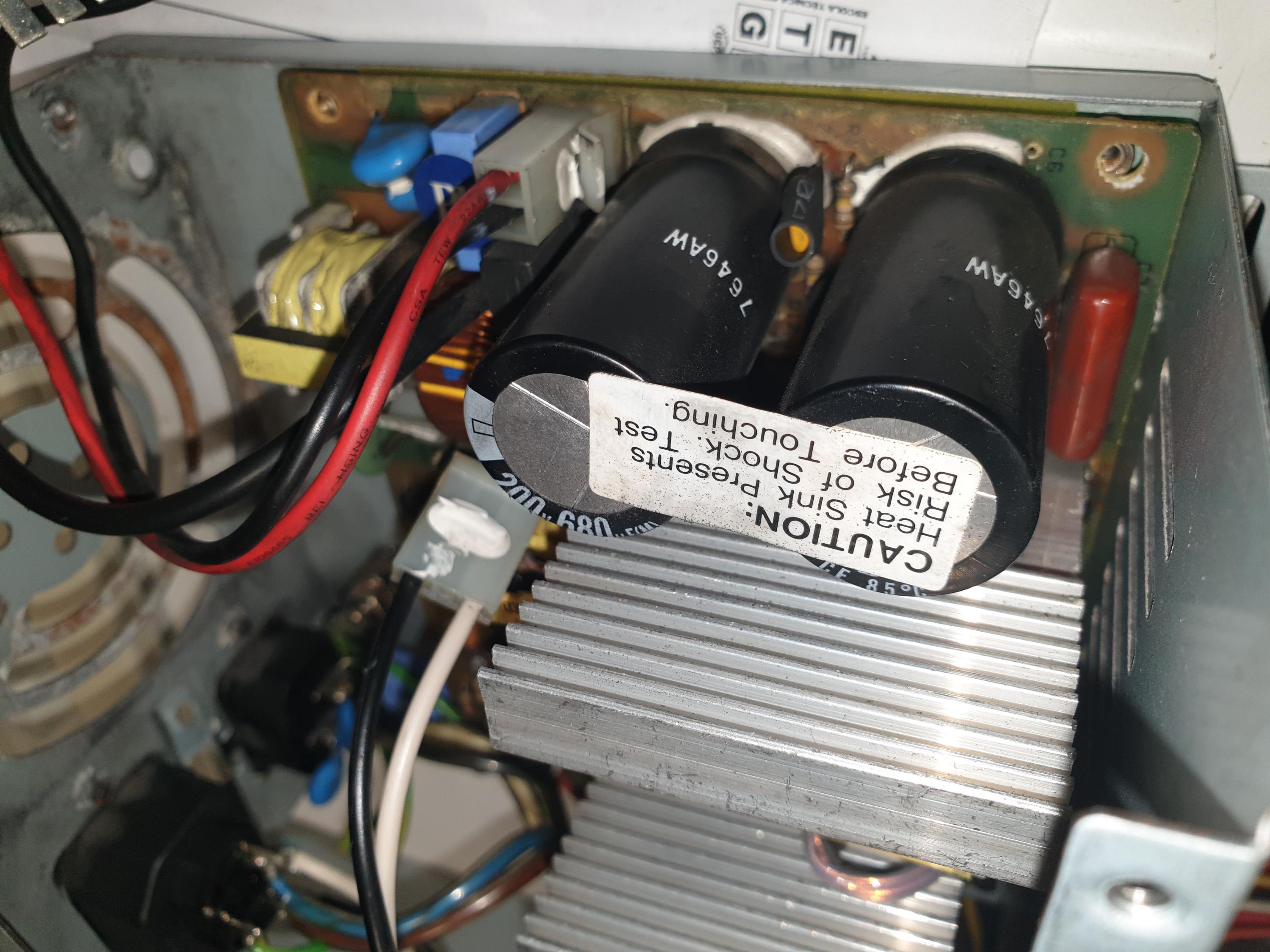 An eMacs PSU... Yup, those are as solid as a PSU can get: Japanese caps, nice fan, good quality parts throughout, and excellent soldering. But what I like the best: that blue "Pb" sticker, indicating leaded solder and components.