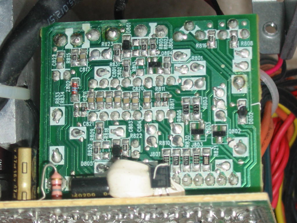 And of course, now you can truly see why someone wrote “BAD” on the PSU label: yup, bad capacitors. In particular, it's the first 5VSB output cap and the second cap on the 5V rail. Needless to say, this power supply has been fully recapped and put back into a working PC. I'll save the recap info for another thread/post, though.
