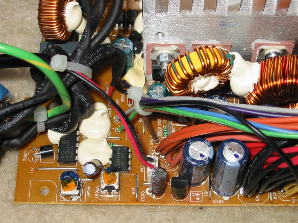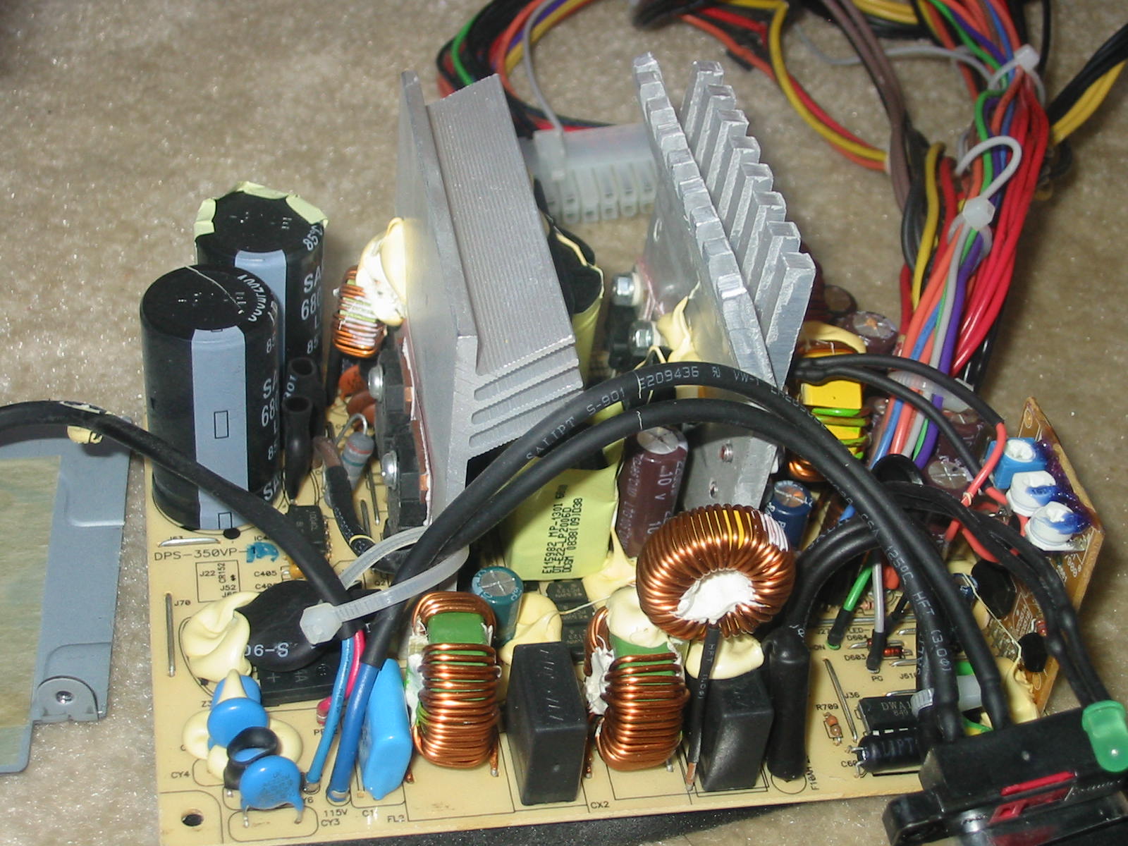 And of course, now you can truly see why someone wrote “BAD” on the PSU label: yup, bad capacitors. In particular, it's the first 5VSB output cap and the second cap on the 5V rail. Needless to say, this power supply has been fully recapped and put back into a working PC. I'll save the recap info for another thread/post, though.
