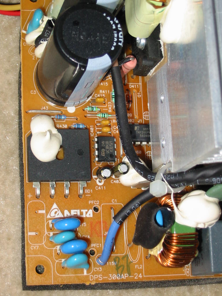 Actually, this PSU looks very similar if not nearly identical to the H305P-01 which c_hegge reviewed way back when and the H305N-00 which cubecomputerchannel posted a video of a long while back, featuring more failed Teapos and LTECs. The only notable difference is the inclusion and the lack of P-PFC, and the fan is mounted differently in those models with a much less convenient airflow arrangement, possibly leading to (or accelerating) discoloration on the underside of the PCB where that resistor is, as shown in the review of the H305P-01.
