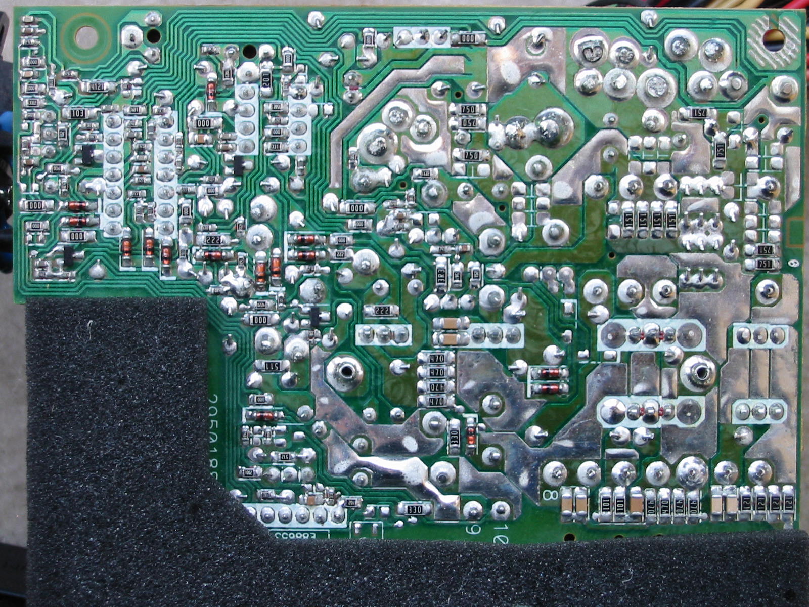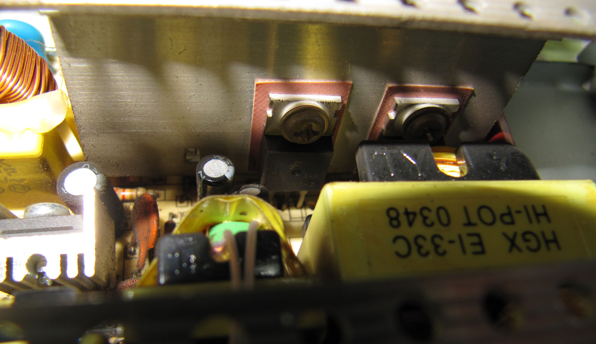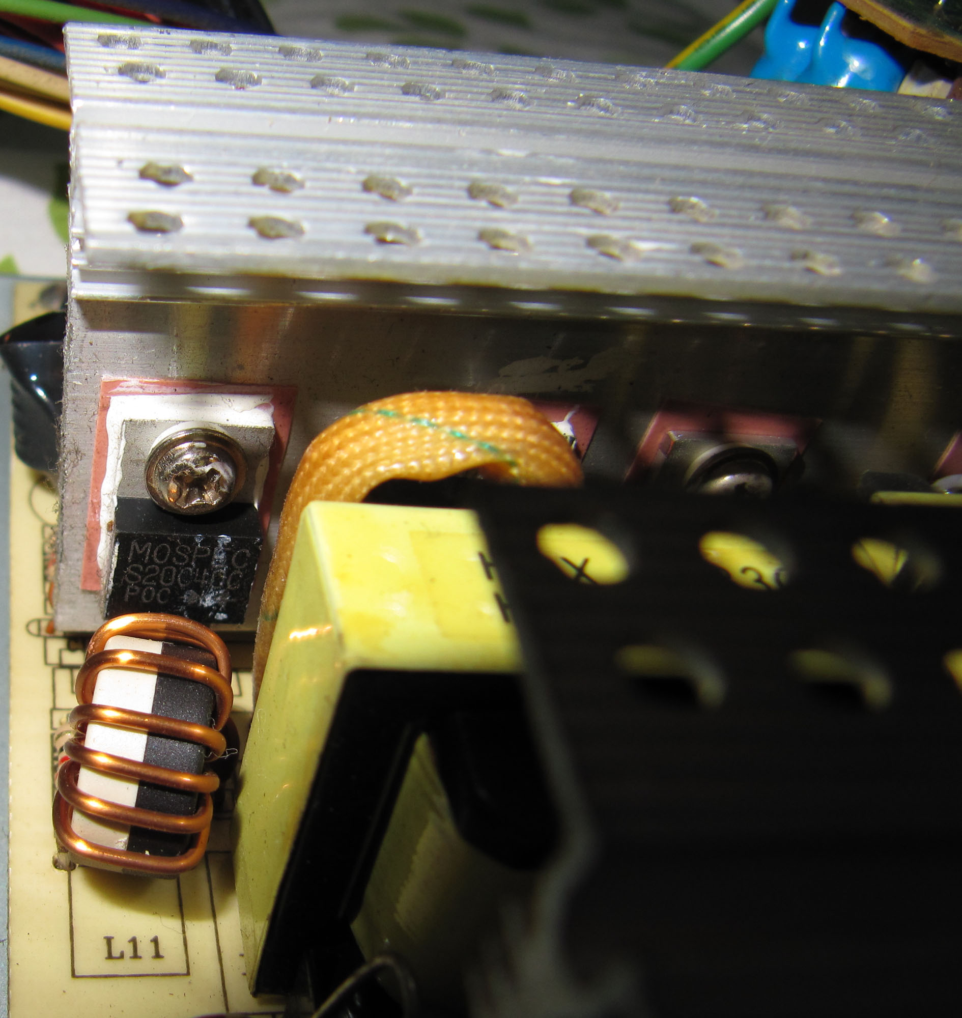 Transistor-wise, I can't stop laughing at how big pads they stuck on the main transistors (13007s?), even though they probably don't put out that much heat. Can be considered a plus somewhat, since you don't need replacement pads if you go with 13009s in TO-3P package.
