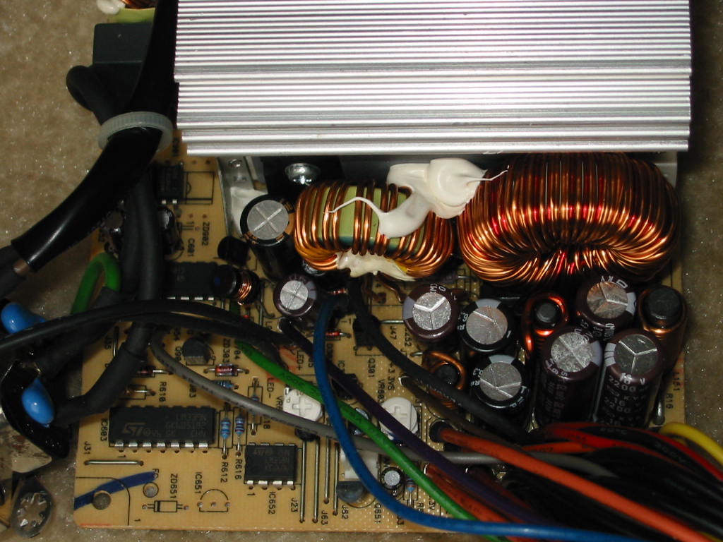 The output caps may look small at first, but that’s only because they are dwarfed by the output filter toroids. On that note, the main PS output toroid is a T130-52 (i.e. uses Micrometals -52 core material, as the light green color with one side painted blue shows.) The 3.3V rail toroid is only slightly smaller and uses -26 core material (T103-26, I think.) All in all, very good job there. Back to the output caps… again, no less than 4 of the output caps are 12.5 mm in diameter. Now the cap choices aren’t the best - mostly Ltec LZG. However, there is a single Rubycon YXG in there on the 12V rail (I guess Delta knows where it counts, as this PSU was installed in an early P4 MicronPC that drew power primarily from the 12V rail.) Another interesting thing to notice is the “5VSEN” (5V sense) line, in addition to the standard 3.3V sense line - Delta really wanted to make sure this PSU’s 5V and 3.3V rails performed top-notch.
