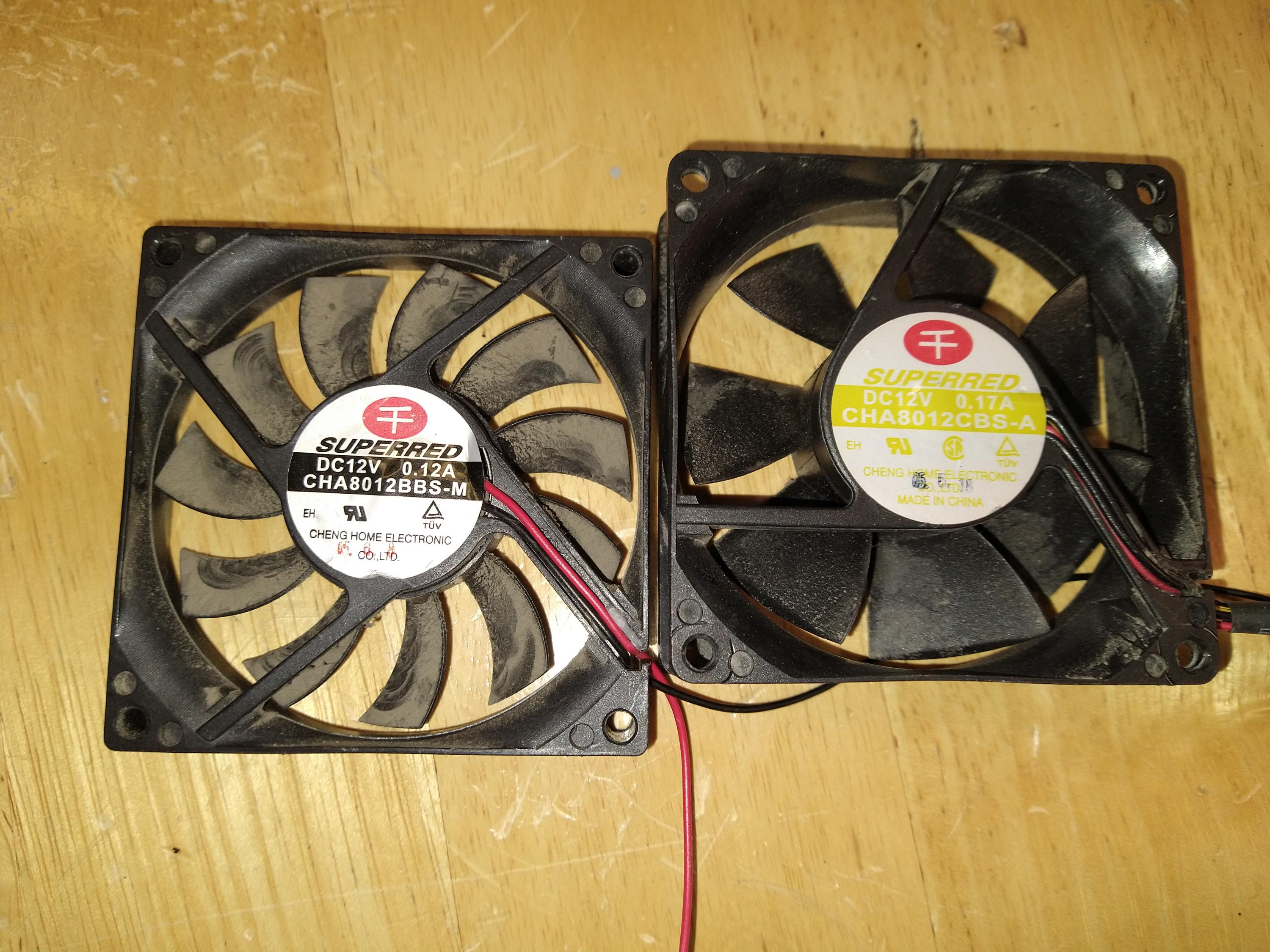 Speaking of the fan, this is it: a Yate Loon D12SH-12, rated for 0.3 Amps @ 12V.