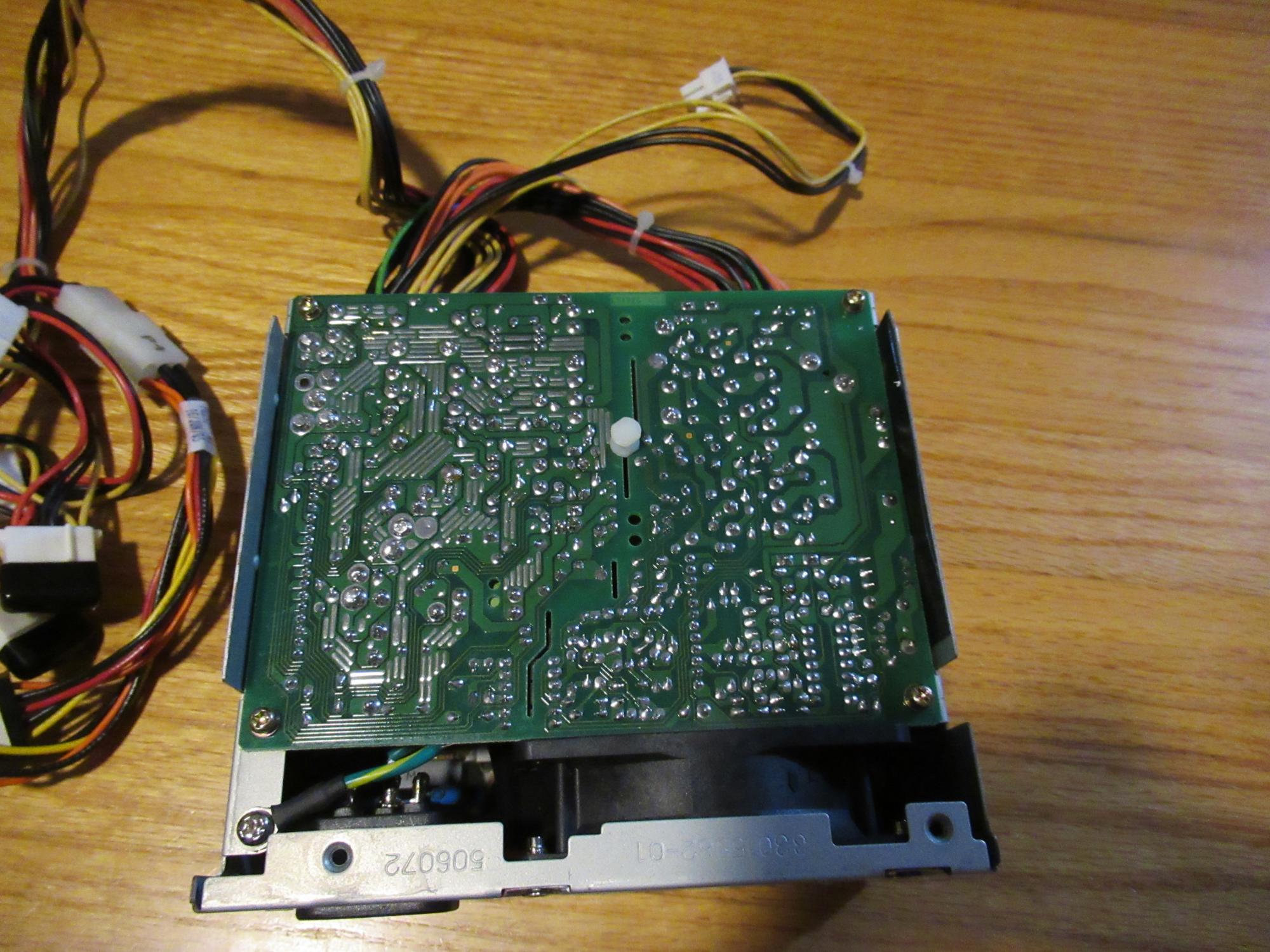 The output wires appear to be a somewhat proprietary “24-pin” affair on the main connector, with all wires being 18 gauge except the +3.3V wires which are 16 gauge and the floppy wires which are 22 gauge. There are five molex, one floppy connector, two SATA with an adapter, one ATX 12V, and one main ATX connector, all manufactured by Unicab. The ventilation is ample with a honeycomb grille. All in all, the unit is internally quite similar to the NPS-250DB previously posted here, but a bit “upgraded” as it’s a higher wattage supply.