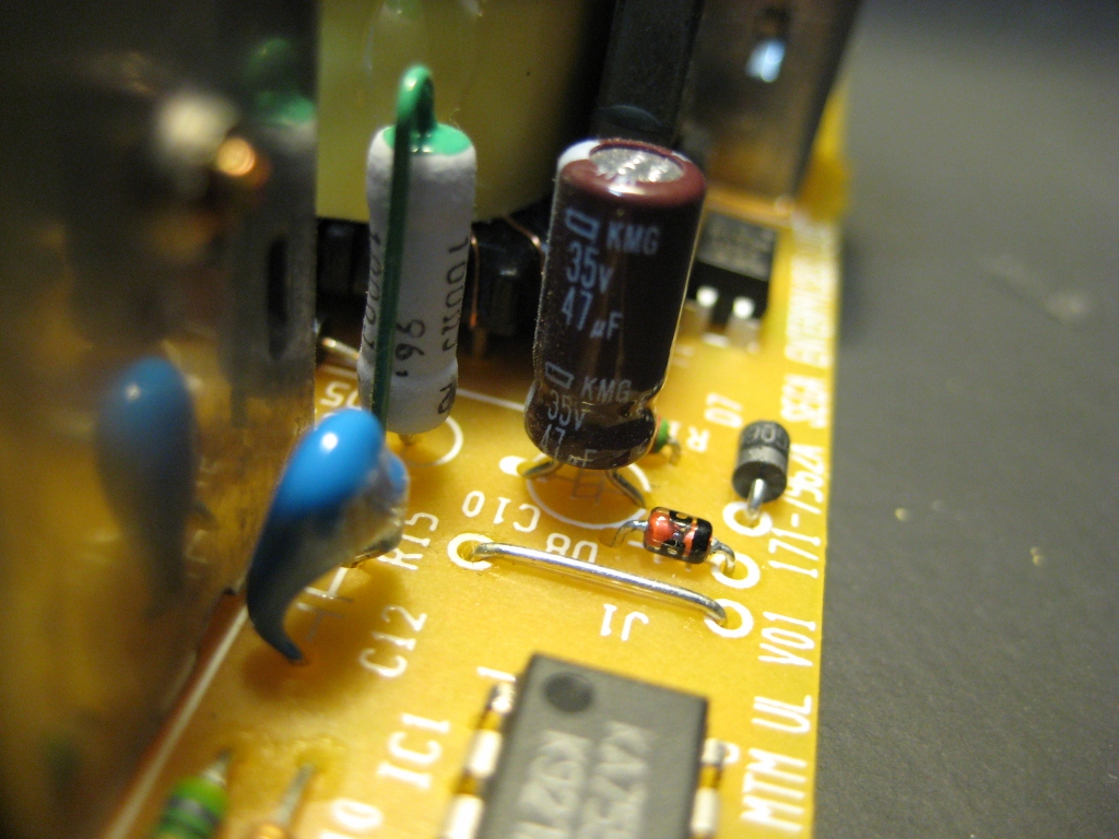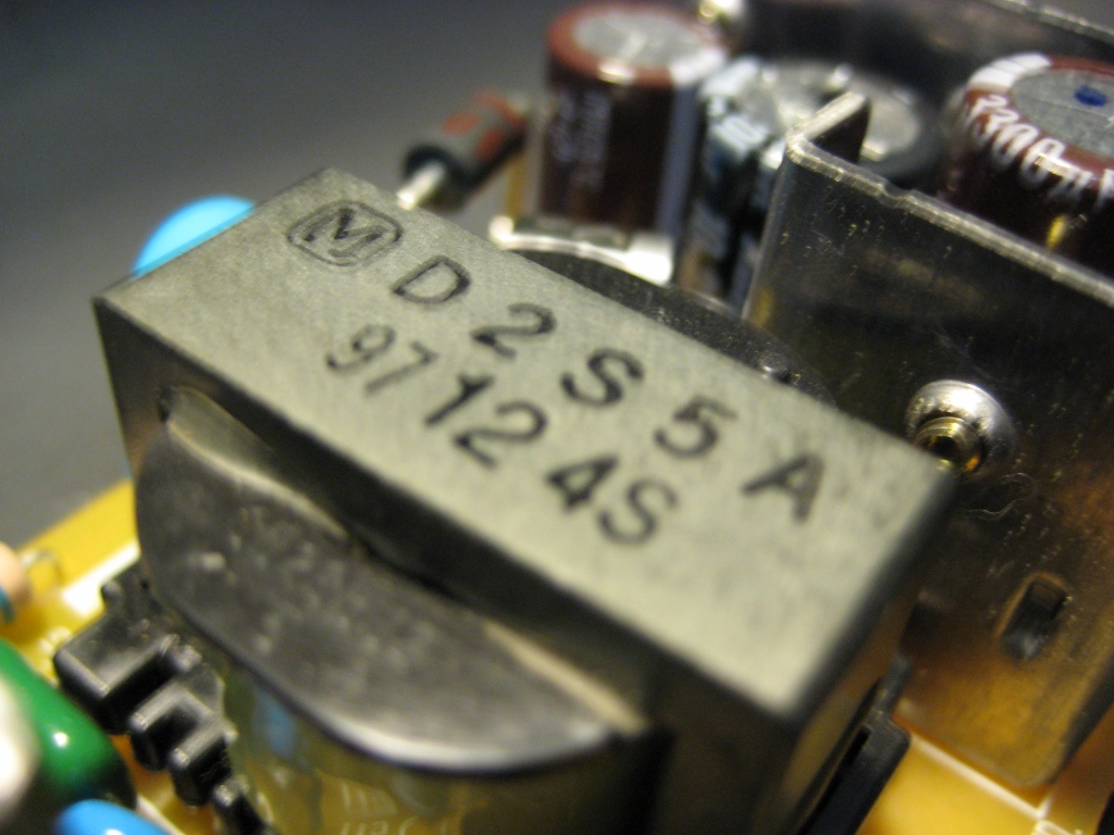 SanKen PS10424D-I (LJ3): FOUR X2 caps, two common-mode chokes, one differential inductor, 3.15A circuit breaker, triac, MOV, Rubycon MXP bulk filter cap, Toshiba 2SK1357 switcher, controller's again "proprietary" on a resin-encased daughterboard that spreads between the primary and secondary. Output: D8LCA20R double-diode (200v 8A), D10SC4M, 2SA1568 (these two are "in" the heatskink next to the controller board). Caps are a mix of ChemiCon KMF and Nichicon PR.