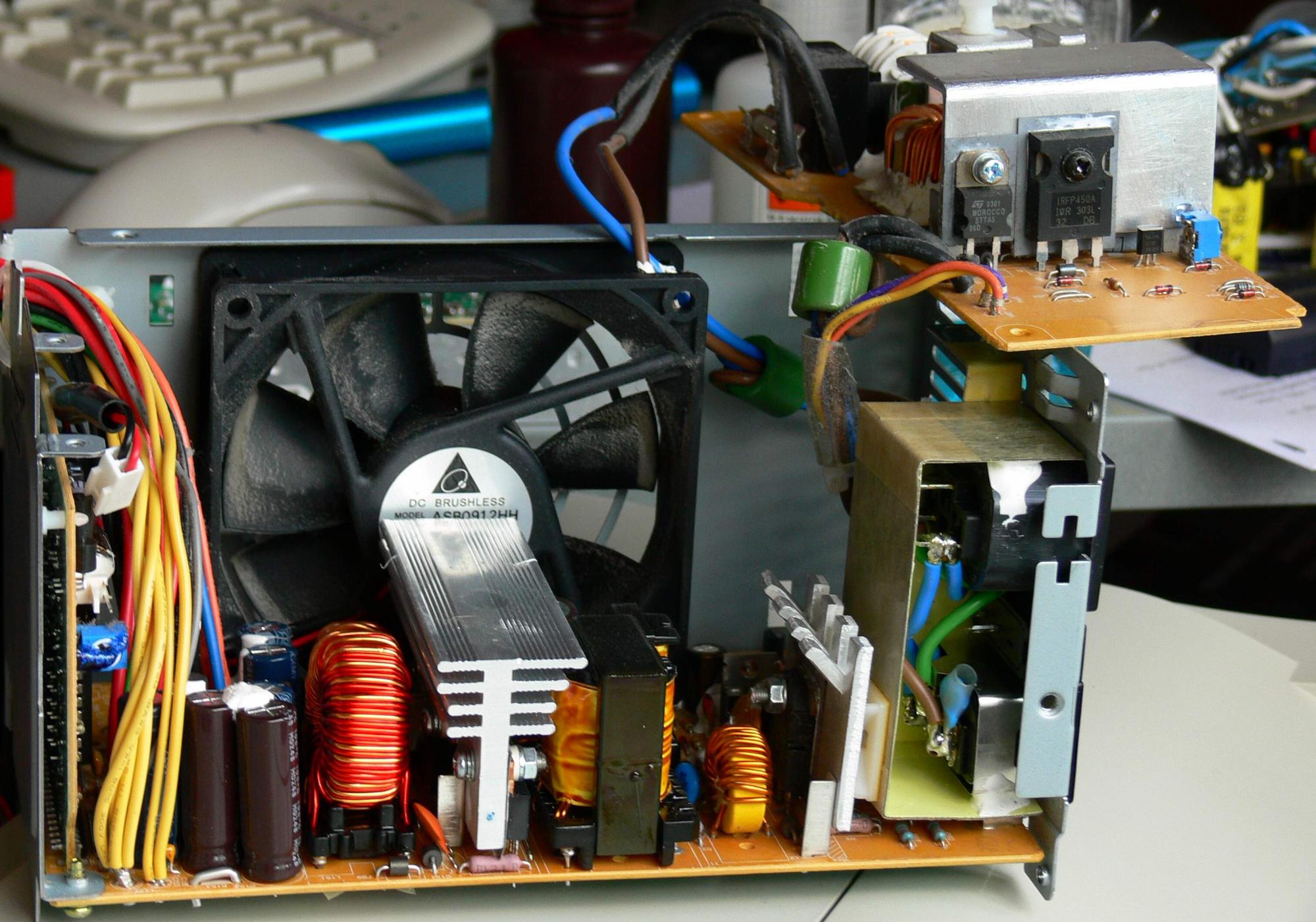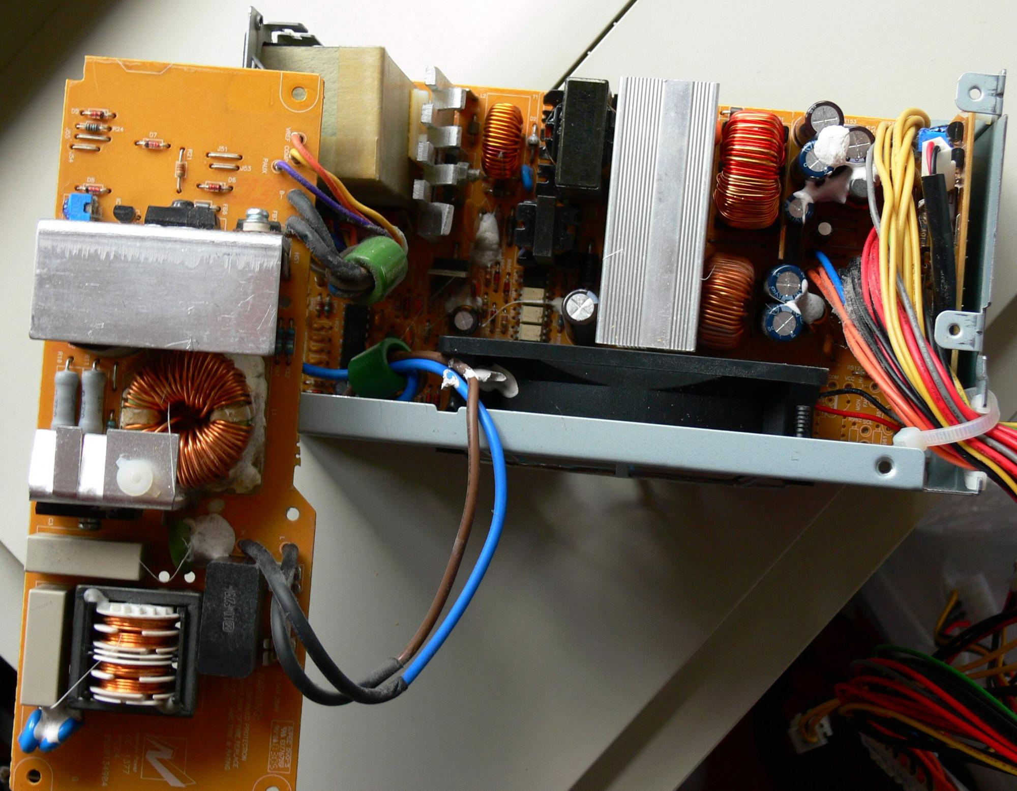 Note that the heatsinks have been removed for the photo, since this supply needs repair (MOSFET is internally shorted).