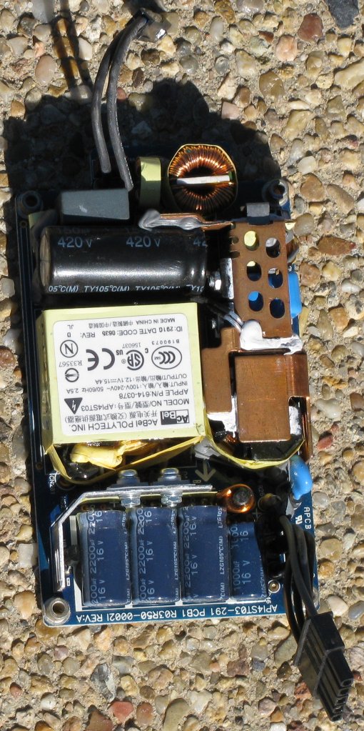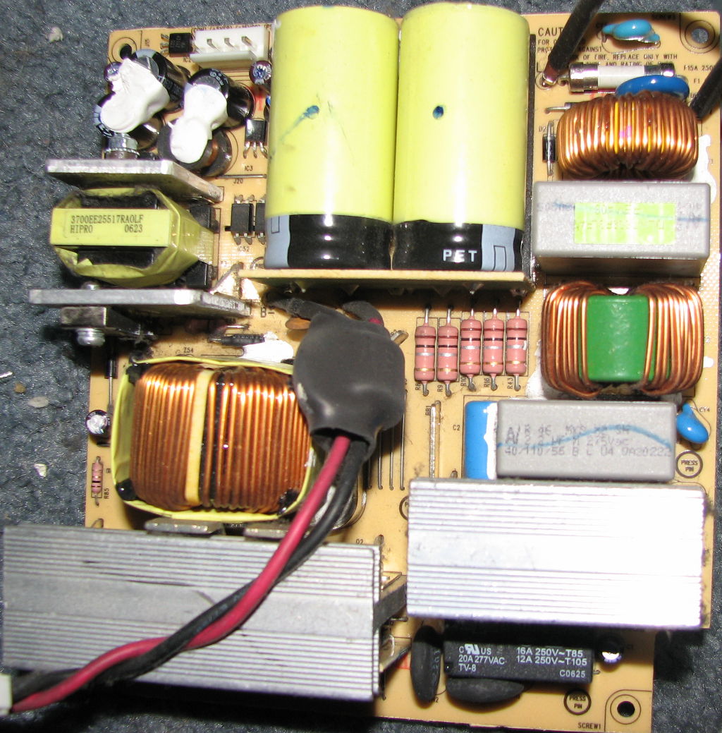 Sony APS-25E (Made in Japan) (LJ4): ~60% of the board is taken up by the primary. Three X2 caps, two common-mode chokes, one differential inductor (on the neutral), 5A circuit breaker, a triac, two MOV's, four Y caps, Rubycon SXS bulk filter cap, 4A bridge, relay and current transformer right before that, Hitachi 2SK1403A switcher, and the controller's on that upright black resin encased "daughterboard", with white writing on it. Transformer is copper tape-wound. Secondary's Elna only (RJ3 / RSH "Long Life"), with a Panasonic/Matsushita MA651 (200v 10/20A), D10SC4M (40v 10A) and a green fullpak 2SA1451 (not sure what its role is).