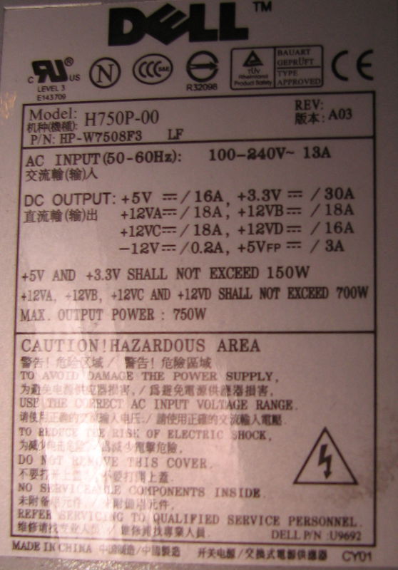 This is the power supply out of my Dell PowerEdge SC1430. Rated 750W.