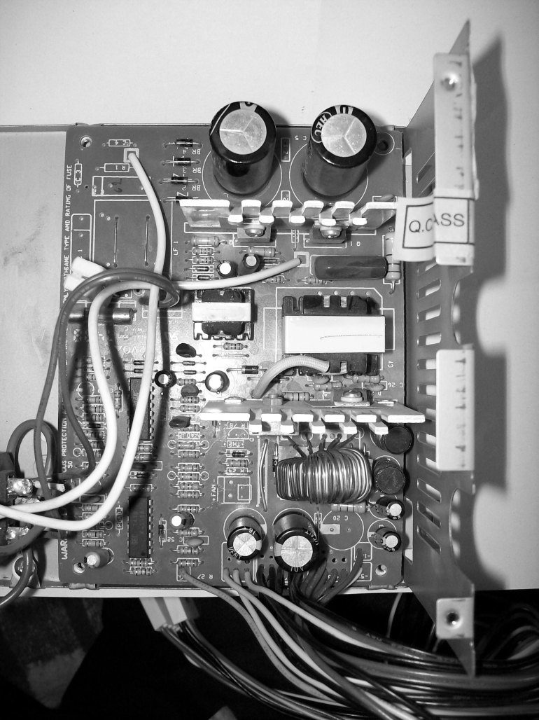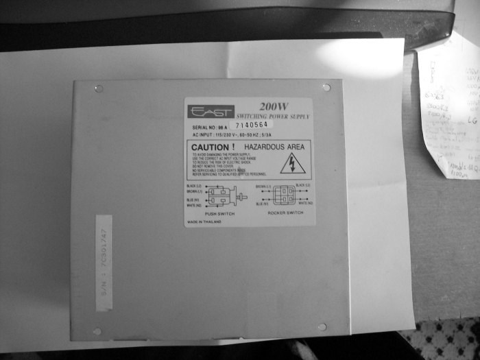 AT power supply that was very "popular" here. The specs are a mystery but once someone opens it up... no ac filter at all. Diode for 5v is s15c40c and two pr3004 for 12volts. Capacitors are Jpcon.