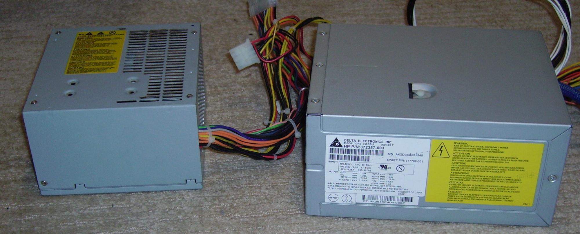 Delta DPS-750CB. Originally from a HP workstation, but currently powering my main PC. In the first Pic, the PSU to the left is a Bestec ATX-300-12Z, just for a size comparison. The unit does actually have five 12V rails. 2 for the CPU, 1 for the graphics, 1 for the ATX connector and 1 for the peripheral and SATA connectors. The fan is a delta Ball Bearing 92mm, and the caps are entirely Japanese (Rubycon, Nichicon, and Chemi-con) with the exception of one tiny LTEC.