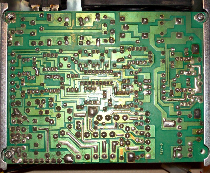 The engineering in this thing is fantastic. The transformer is huge - especially for a 105W max output! There are three Toshiba power transistors in parallel on a massive heatsink (with OR-ing resistors), controlled by one main board. Current sensing is high side, not some low side stuff which might ignore earth shorts. (The output can be fully floated, which has been useful several times.) And a very clever way of reducing the power dissipated in the transistors: two SCRs select between three taps on the power transformer, reducing the input voltage to the transistors at lower output voltages. The control logic is surprisingly simple, comprising a few op-amps and a TL431 reference. The potentiometers on the front are only single turn, but I haven't needed precision from it yet, especially given the gauges are only useful as a general guide.