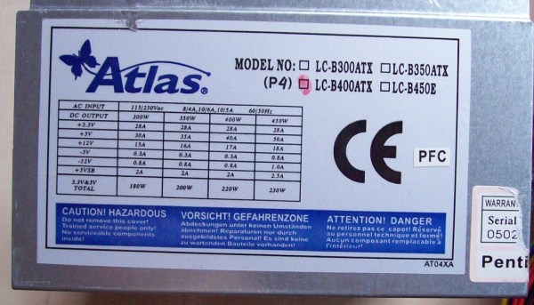 This ATLAS has pfc and somewhat decent buid, but it's clearly not going to do 400W. According to the markings it may be a DEER. That smd chip has "2003" written on it. Came with missing caps and blown mbr1645 on he 12V rail. Put and mbr2045 there and recapped it. Works.